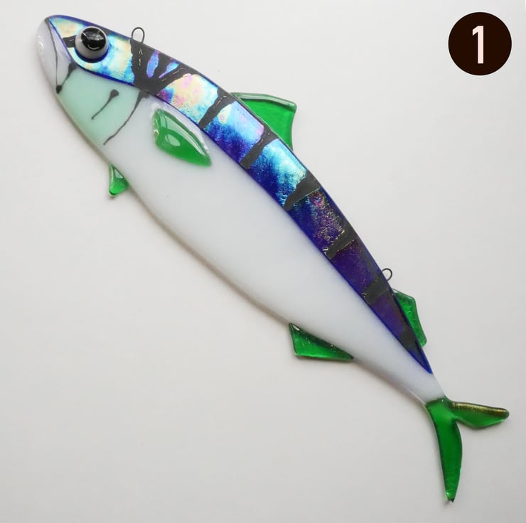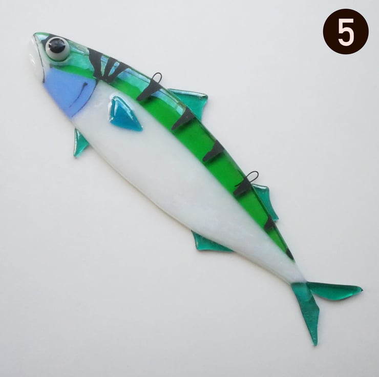These fused glass mackerel are ready to being a splash of ocean colour to any indoor or outdoor space. Available in blue, green or aqua, each fish has a luminescent sheen and has two integrated hooks for easy hanging in your chosen location.