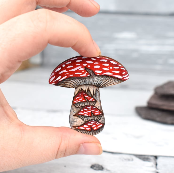 A fabulous fly agaric style toadstool brooch, hand burned using pyrography and coloured with art pencils and paint. Ideal for a fairy lover or woodland enthusiast.