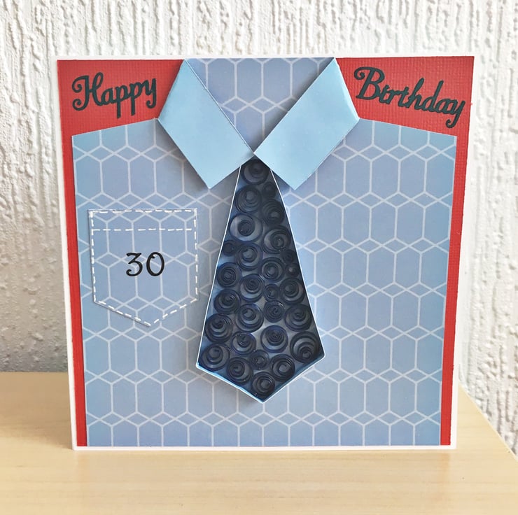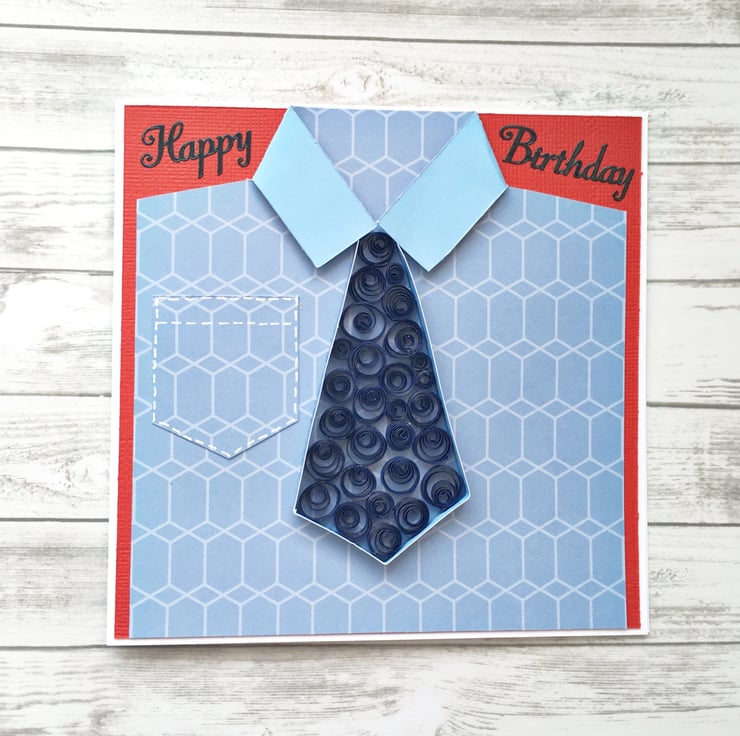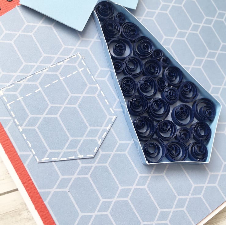 The light blue shirt collar is folded over a hand-quilled tie for a truly individual look. There is also a pocket with a faux stitching effect. The patterned blue shirt sits on a red background.