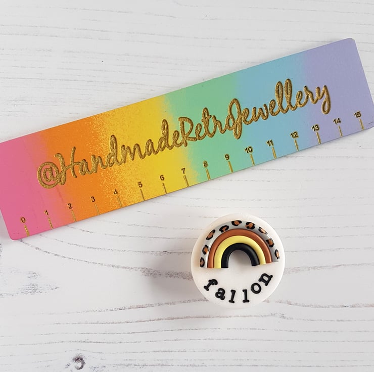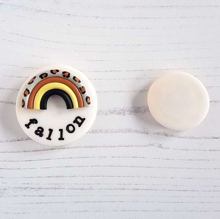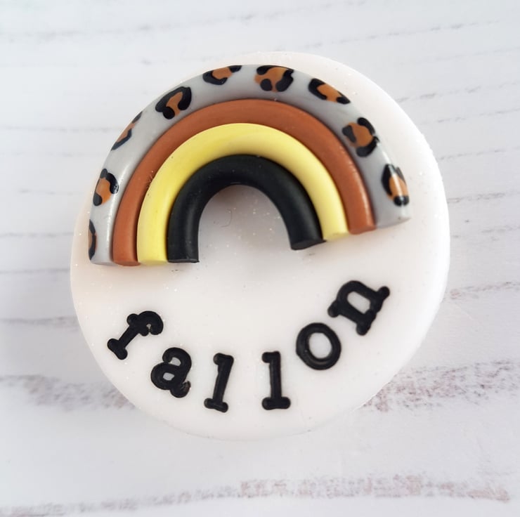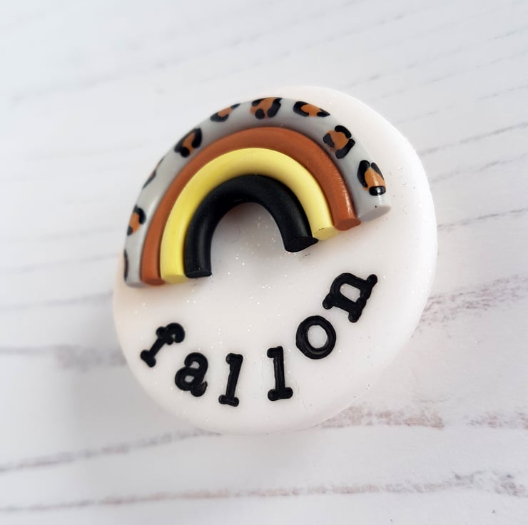 This gorgeous rainbow needle minder is hand made by myself using polymer clay, with a white glitter clay disc base, and features a brown, grey and black toned rainbow with an animal print pattern hand painted on the top row, then glossed to seal.