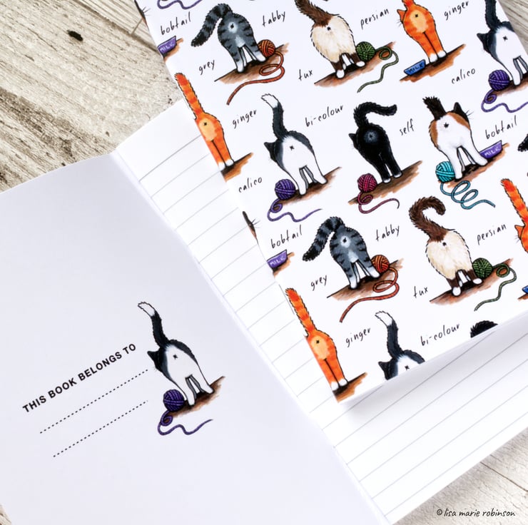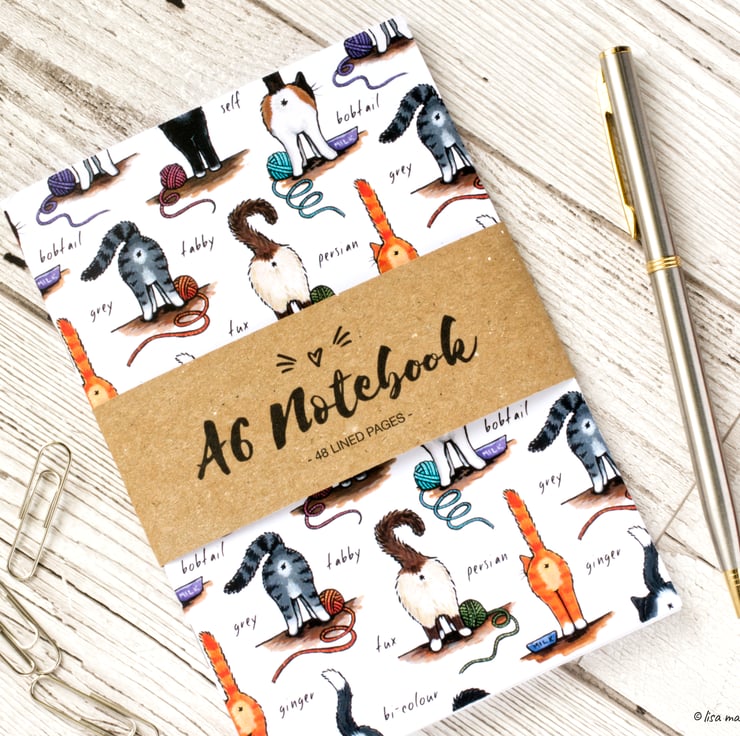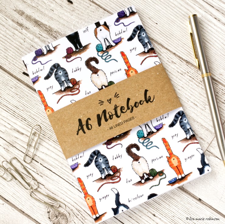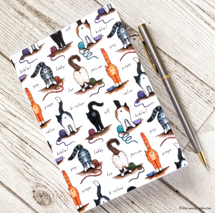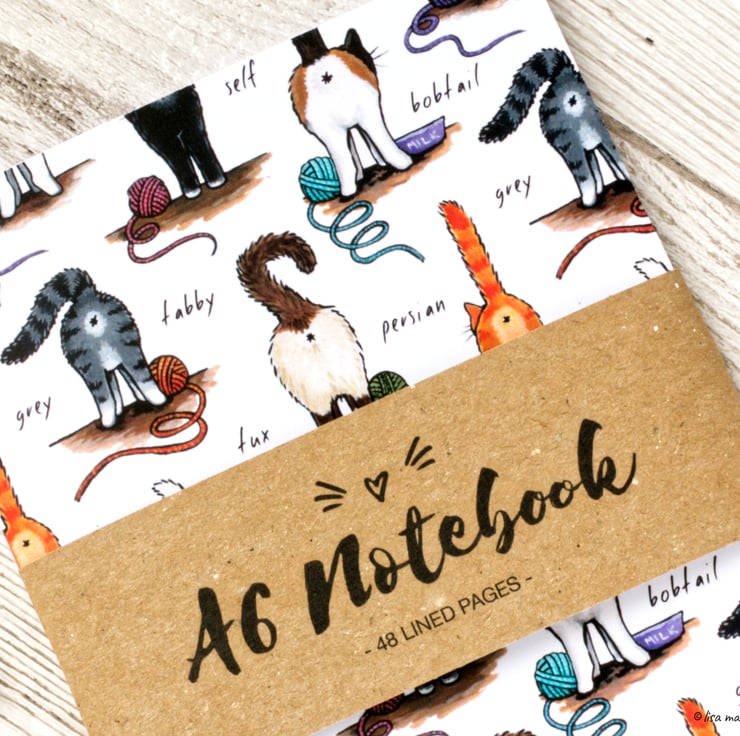A6 Cat Notebook, with 48 lined pages and a fun cover design featuring an assortment of different cat bums. Tux butts, fluffy persian butts, tabby butts, and more!