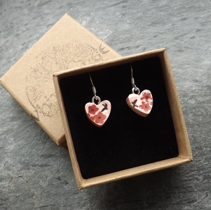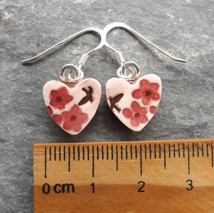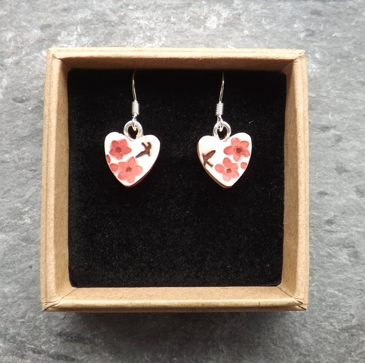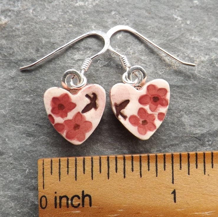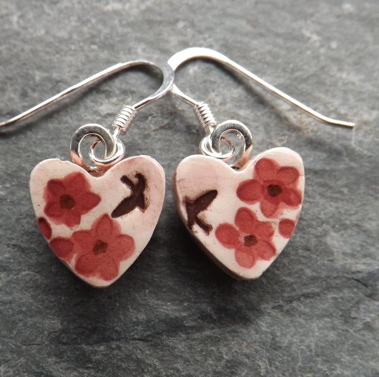 These pretty earrings have birds and flowers stamped into the wet clay, and a wash of pink over the background, with a deep rose pink on the flowers.