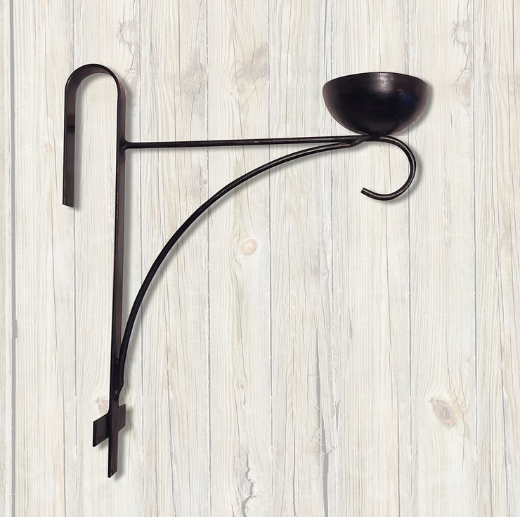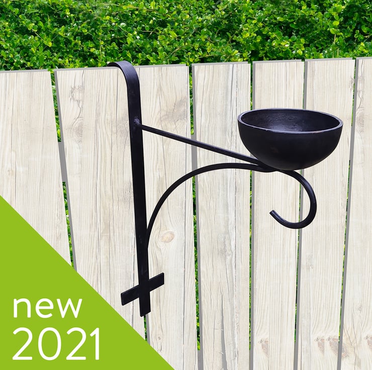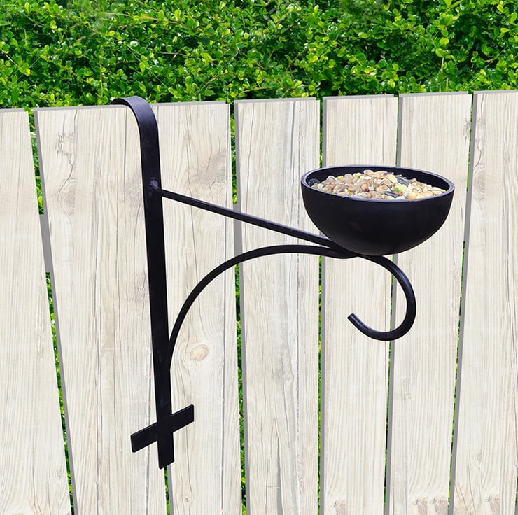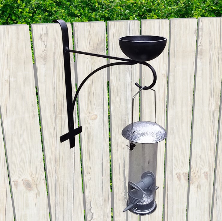 Handmade 'fence hanging' bird feeder bracket with bowl and hanging hook for additional feeders. Hang along fence, trellis, and balcony. Sculptured arched bird feeder with 9cm bowl, approx same size as a hanging basket bracket. Includes drainage hole in bowl and stabilising bar at base. Made of mild steel and finished black. Not suitable for hanging baskets. Silver feeder in picture 4 not included. Please contact me if you would like this as post or wall mounted item.