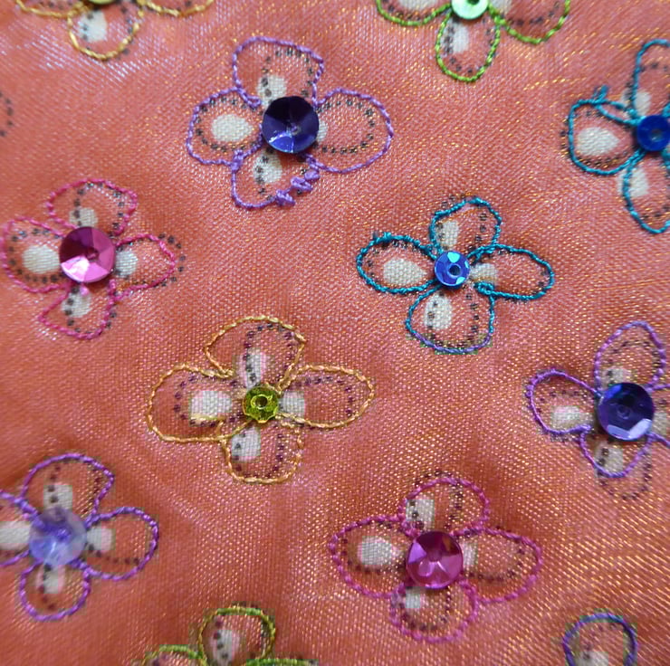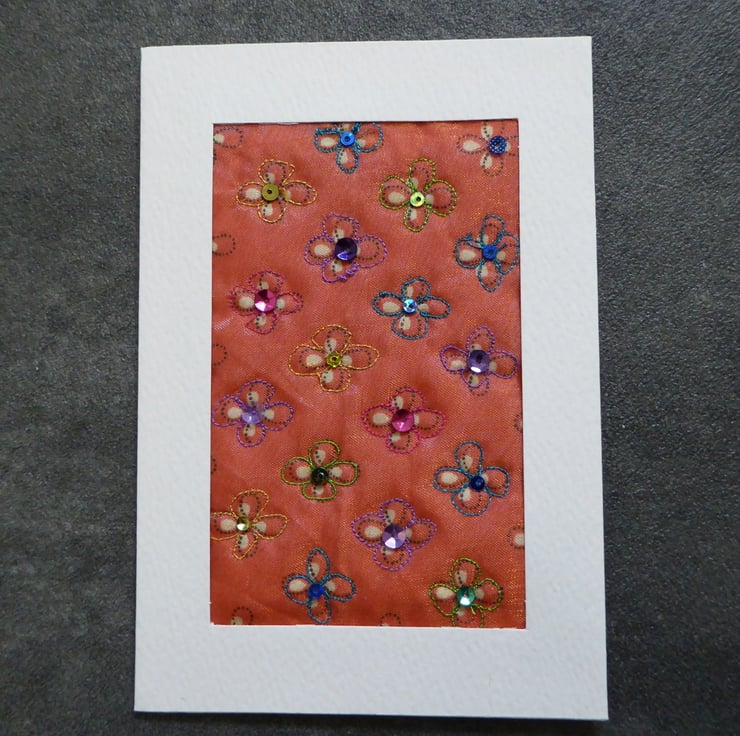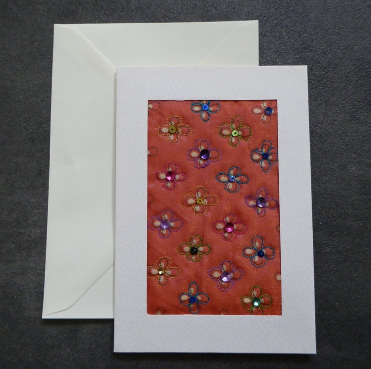 Machine embroidered multi-layered flower design in a cream embossed quality aperture card, with envelope.