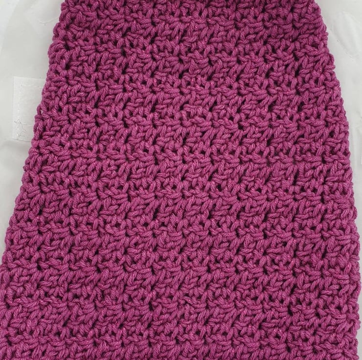 This listing is for a very cute hand crocheted dark pink sparkly dog jumper. The jumper has a ribbed collar and comes complete with a black "handmade" tag. It's hard to see in the photos but the yarn does have a pink metallic thread running through it which gives the sparkle.