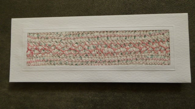 Hand smocked embroidery on spotted cotton fabric in a white embossed quality aperture card, with envelope.