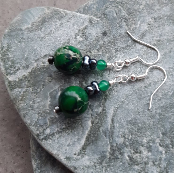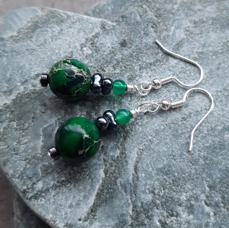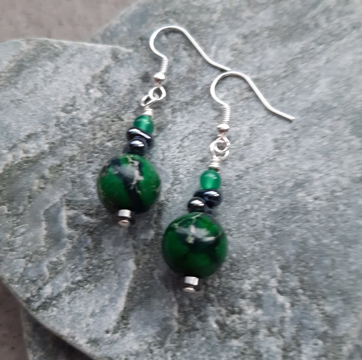 Green Variscite, green agate and a small haematite semi precious gemstones with some very dark blue almost black glass beads are attached to silver plated ear wires.