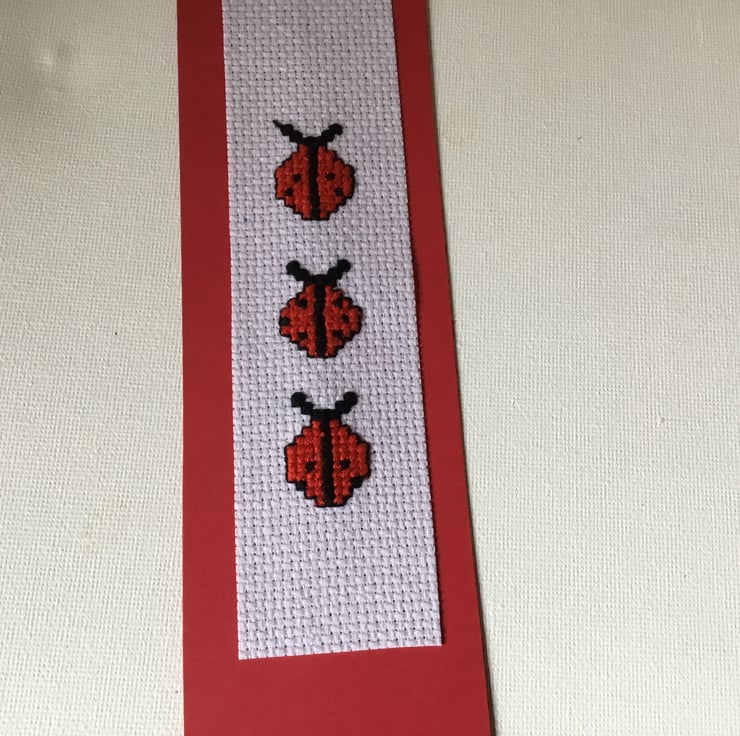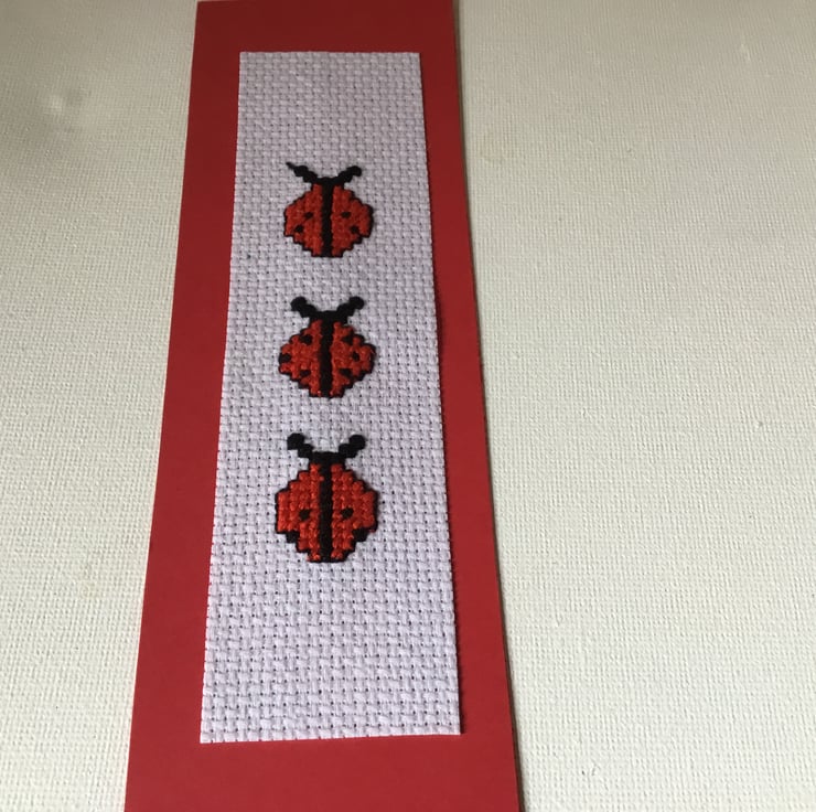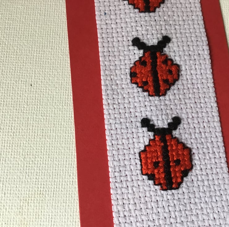 Cute lady bird bookmark which is handmade using cross stitch and mounted on red card.