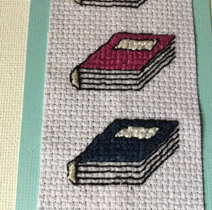 A lovely cross stitch bookmark with three cross stitched books on the front.