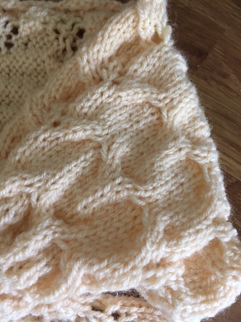 This popular cross over scarf is knitted in DK Honey and in the intricate leaves & cables pattern. Small enough to wear over a crew necked sweater yet large enough to pop over a jacket on cooler days, it is a welcome gift or addition to your own wardrobe.