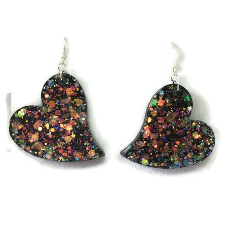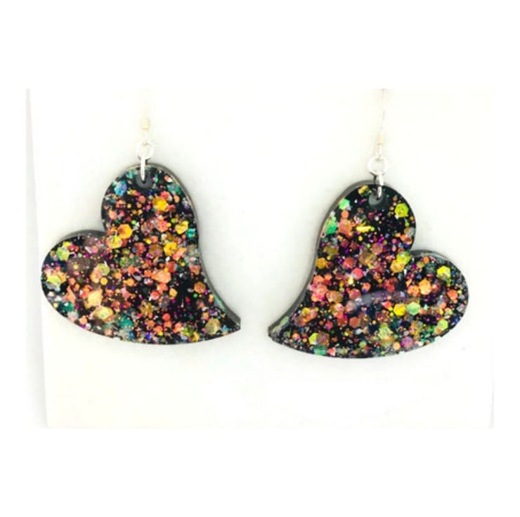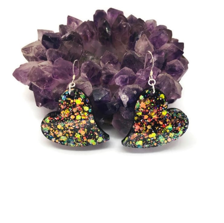 I created these sparkly heart earrings in layers, the first layer with gorgeous opal colour shifting jewel toned glitter suspended in clear resin and then a layer of black opaque resin, which dangle from sterling silver ear wires.