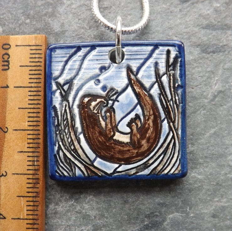 This square pendant features a playful otter. I have washed soft blue across the background, and painted the border, sides and back in deep blue.