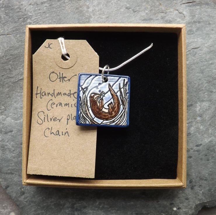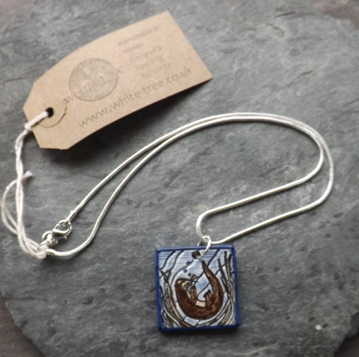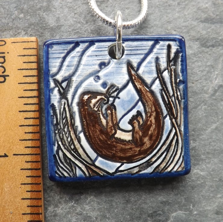 This square pendant features a playful otter. I have washed soft blue across the background, and painted the border, sides and back in deep blue.