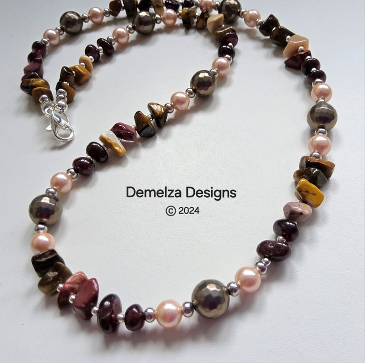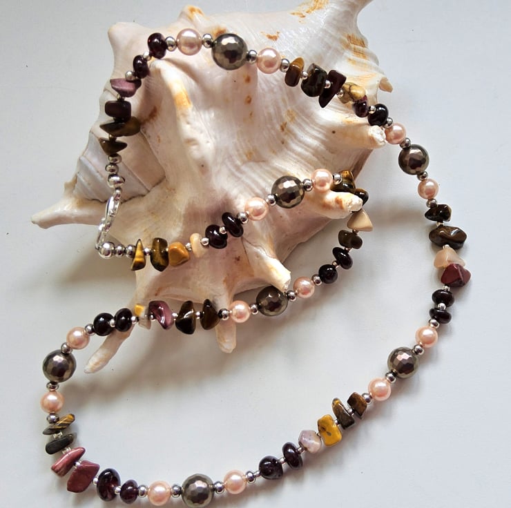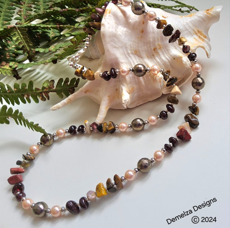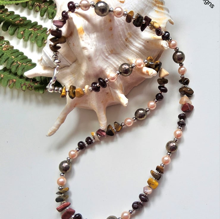A feminine necklace designed and hand crafted using a mix of genuine mookite and deep Indian red garnet nugget gemstones complimented with bronze colour faceted 8mm and 6mm cream shell pearls. Within the design are quality silver plated 2.5, and 4mm spacer beads adding a touch of a sparkle and opulence. This item will appeal to those seeking total designer individuality for genuine gemstone jewellery on a budget. Finding this in today's market is a rarity. Mass produced businesses hype up their profit margins for 'one off' items. Small businesses designing for pleasure as apposed to high profit margins are a rare find!