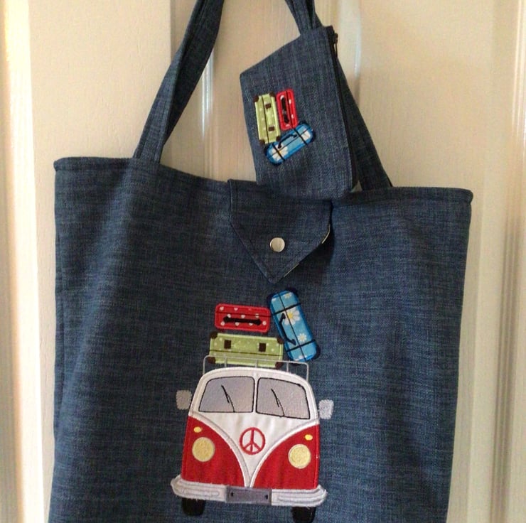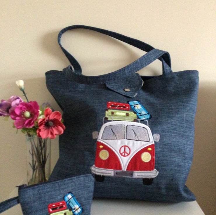 I have appliquéd a retro Volkswagen van with suitcases on roof, in red and white and it is finished with satin stitch embroidery .
