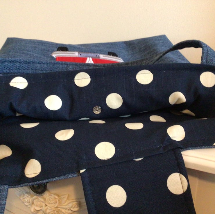 The fabric is a lined curtain fabric in denim blue with a linen look and is lined in a navy polka dot upholstery fabric.