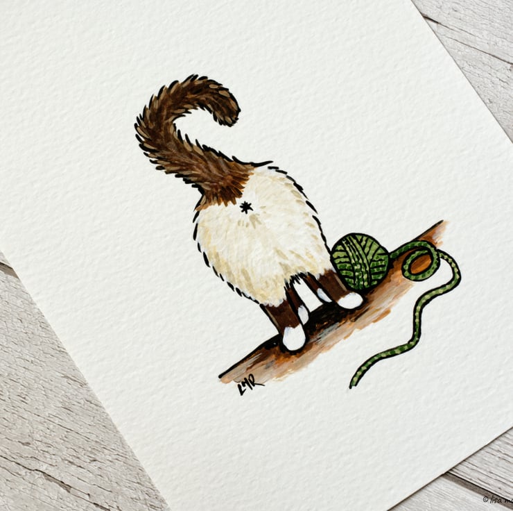 One of a series of paintings featuring cats showing their butts. A fluffy persian or ragdoll type cat with long hair and cream & chocolate colouring. This fluffy butt stands beside a green ball of wool