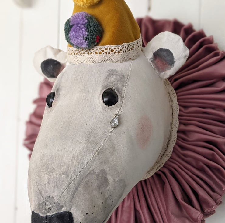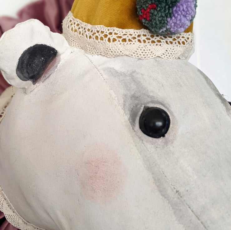 Hand and machine stiched in cotton and hand painted, with a dusky pink ruffle collar in lush velvet fabric. His clown hat is muted gold vintage velvet, with hand made pom poms (i love making pom poms so had to use them on this piece ).