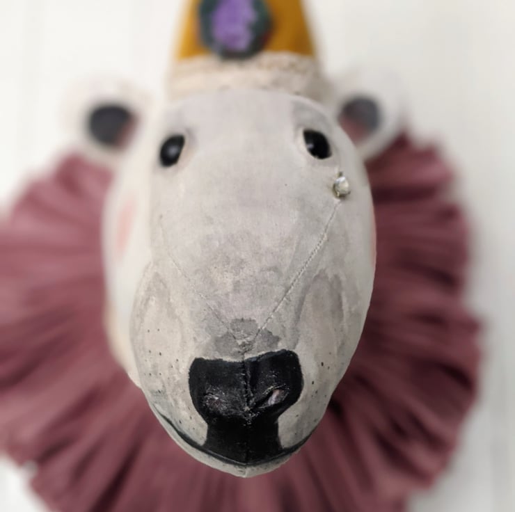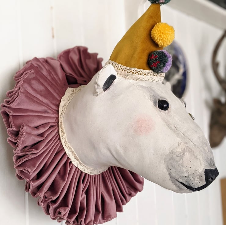 I love Victorian circus imagery, the colours the fabrics they used, so I have been wanting to use that on a piece for a while now so along came a polar bear...and why not.