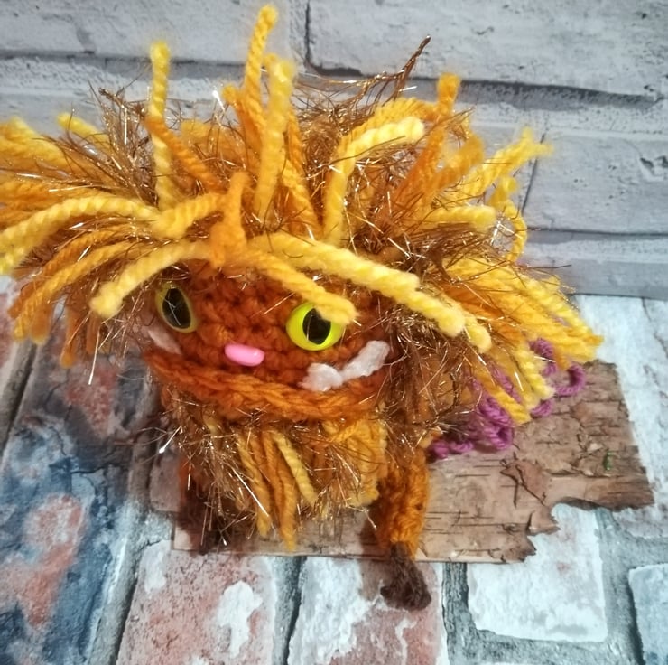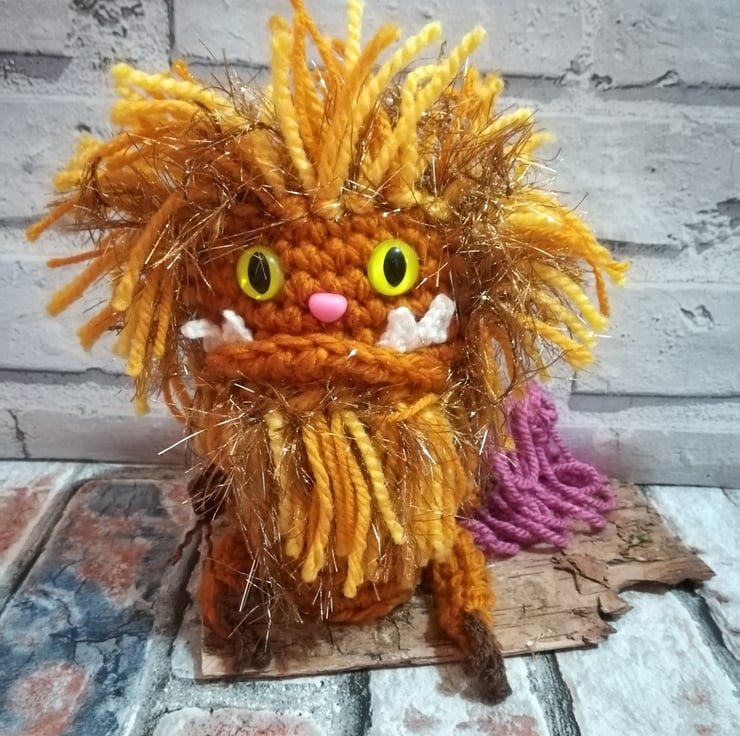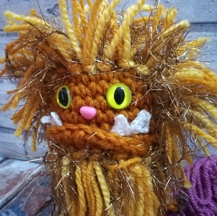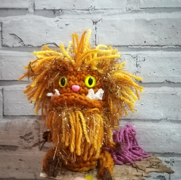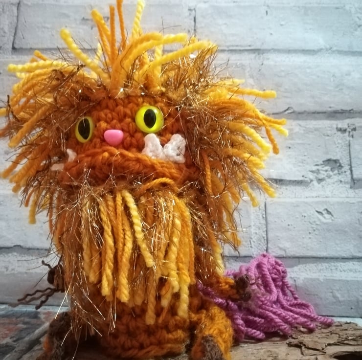 This zouwu is made using several different yarns, especially the mane area, which has some gold sparkle.