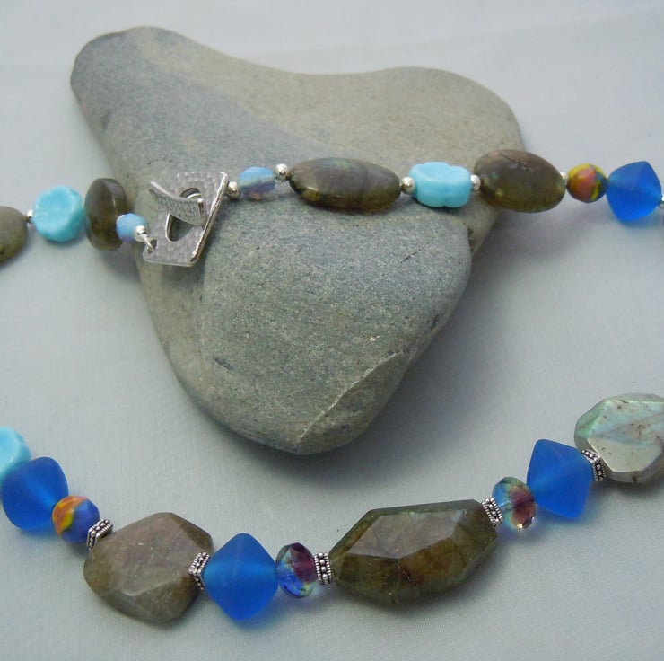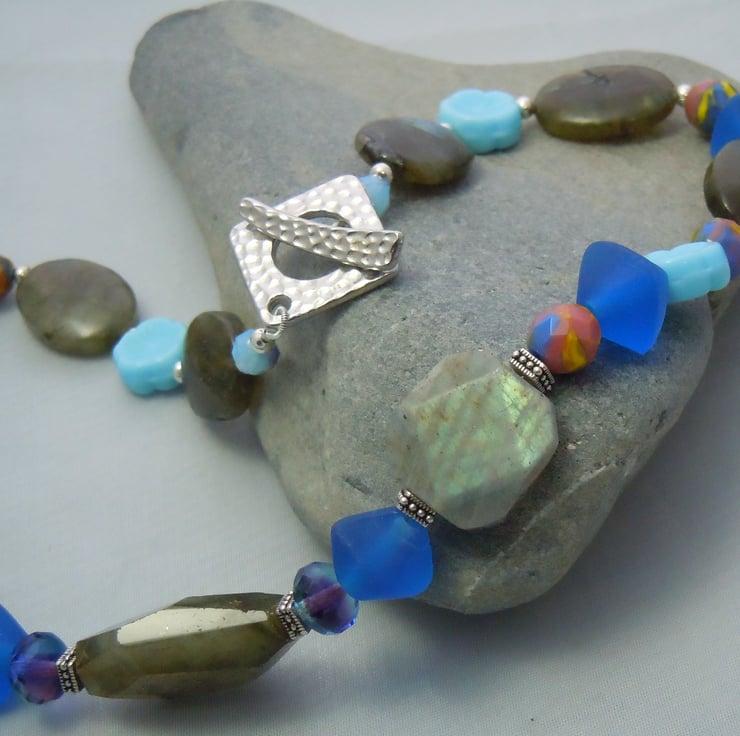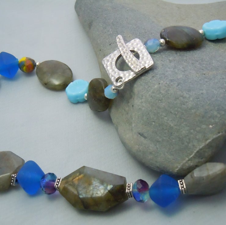 A statement necklace of chunky irregular faceted semi precious Labradorite beads which have flashes of iridescent greens & blues reminiscent of the Northern Lights. Also with stunning blue bicone glass beads with paler blue Czech flower beads & Czech glass blue/yellow/pink marbled faceted round beads & faceted rondelle in blue & purple. Also silver plate round & square spacer beads & finished with a TierraCast silver plate textured square toggle clasp. A stunning collection of semi precious & glass beads.