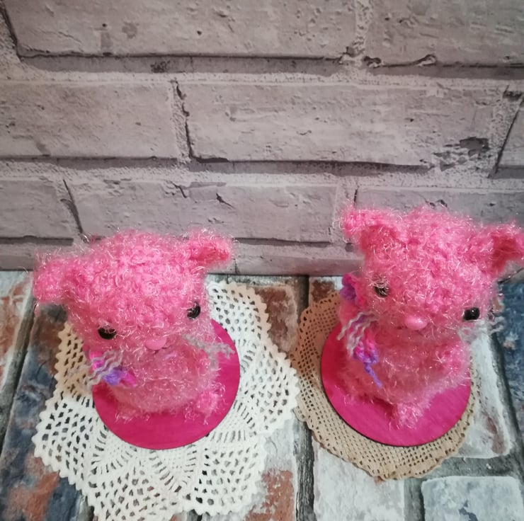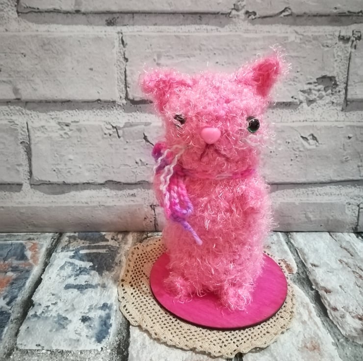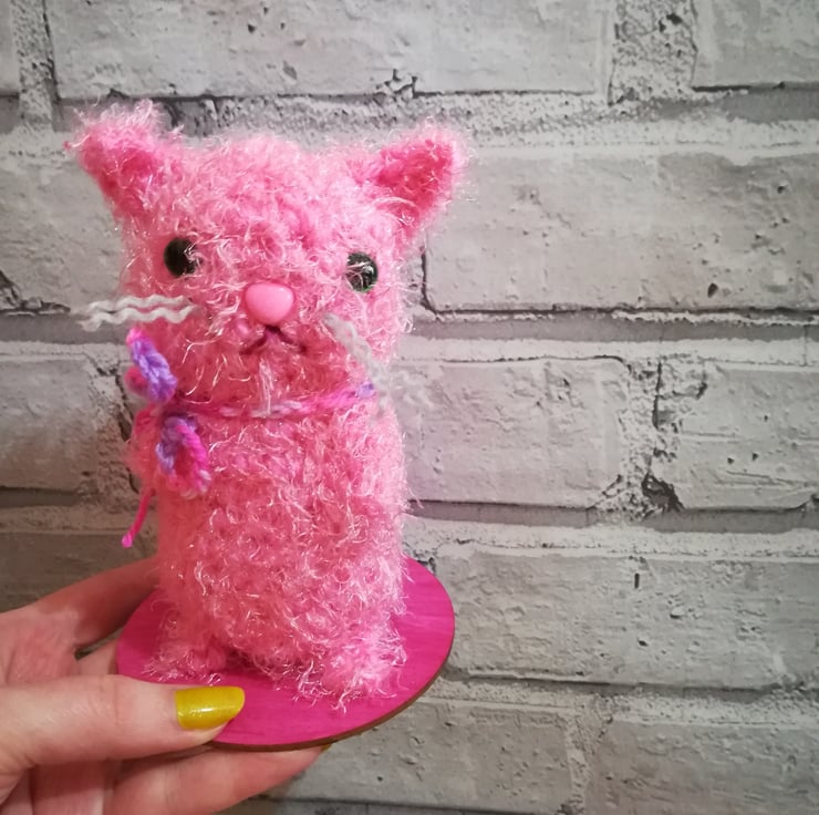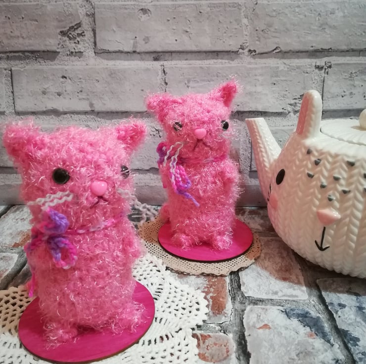 These sweet kitties are made using a soft fluffy pink yarn. They have a little bow and come on a pink wooden base.