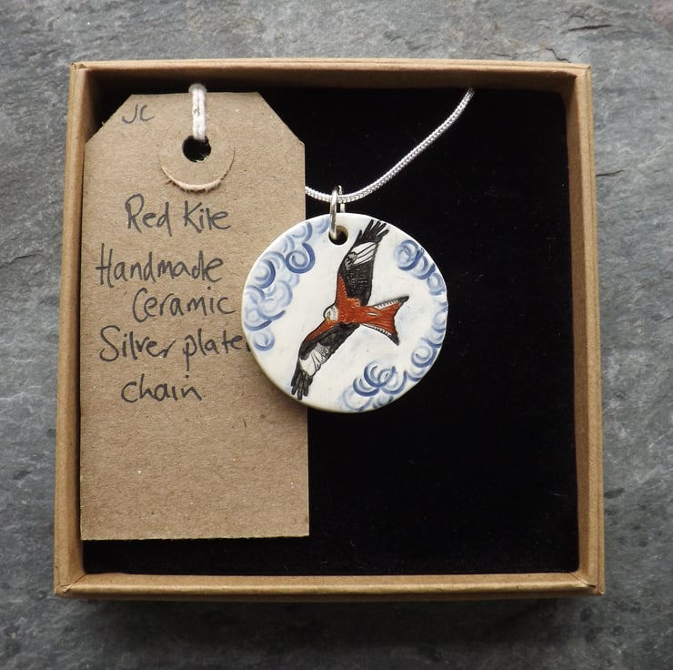 This circular pendant features a red kite, magnificent and graceful, with its striking markings and distinctive forked tail. As with all my jewellery it is made and decorated entirely by hand.