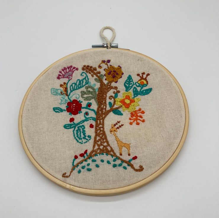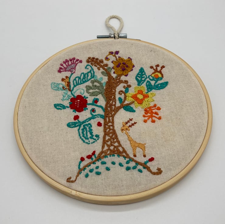 Sewn in lovely autumnal shades of thread, depicting a tree, flowers and woodland animals