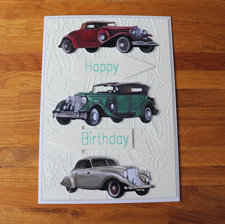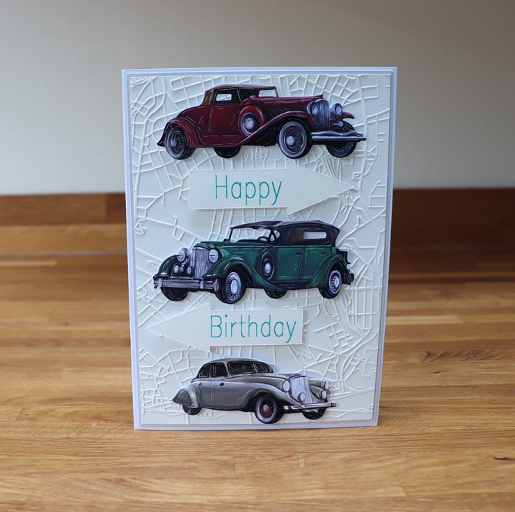 The mat and layer is light grey and the second layer in cream that I have embossed with a street map design, three vintage cars are the highlight of the design, with Happy Birthday on road sign arrows. Sale Item.