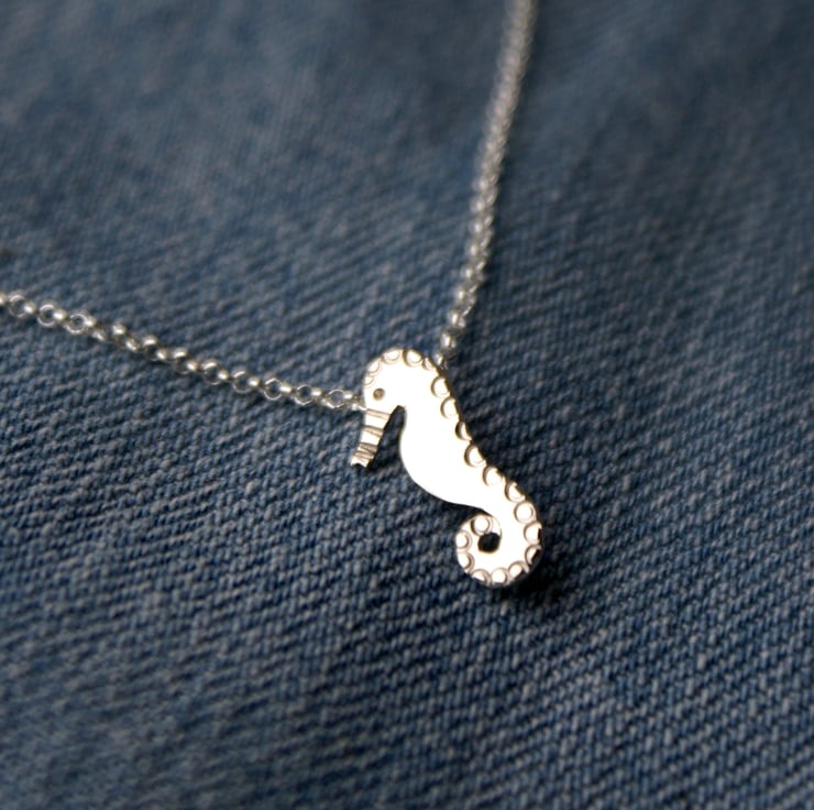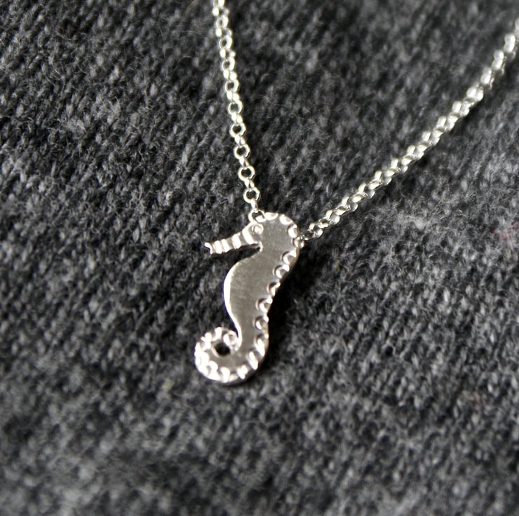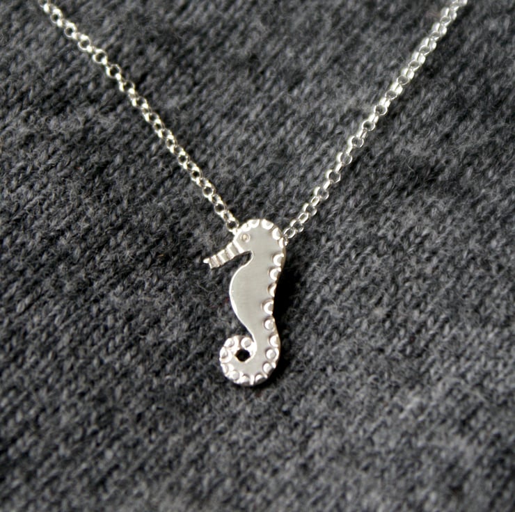 A cute little necklace cut by hand from sterling silver with a jewellers saw. This little seahorse is decorated with little circles for texture and polished to a shine.