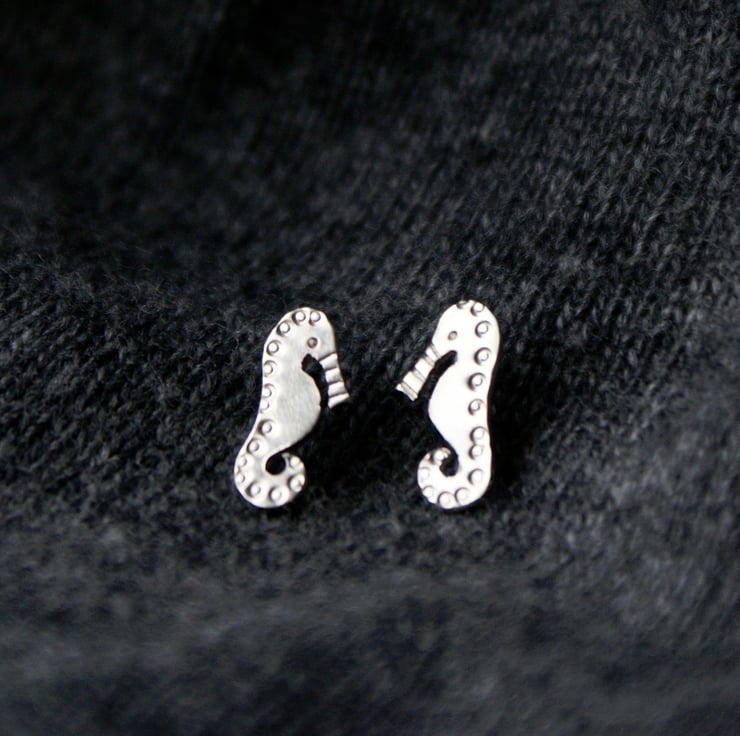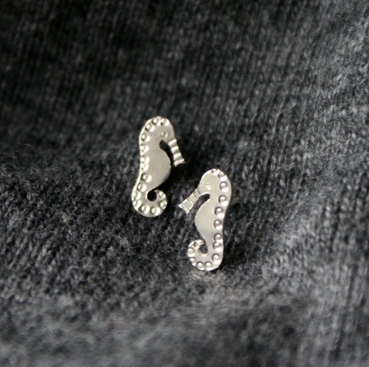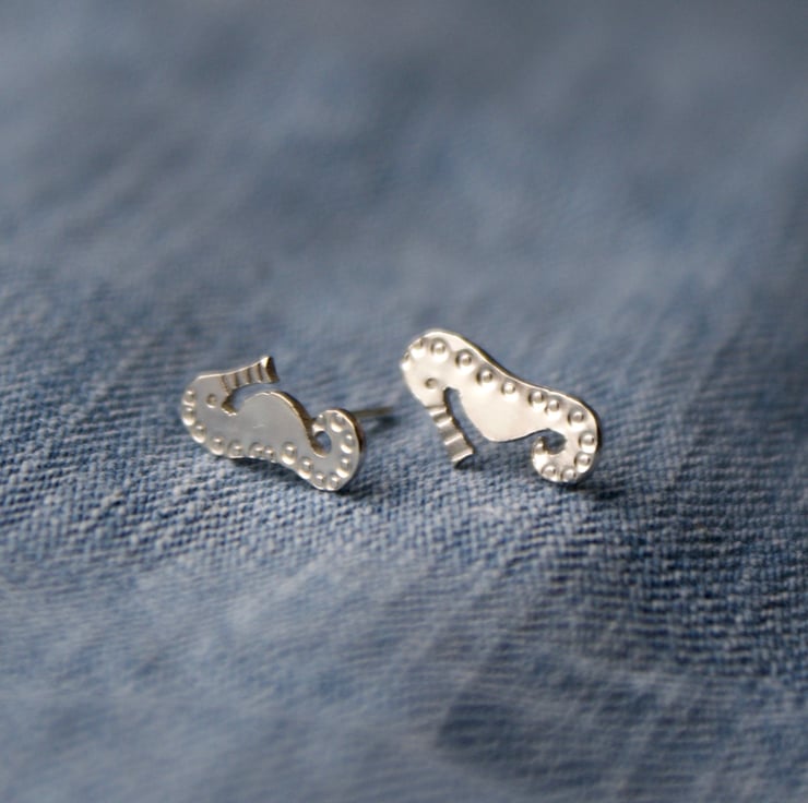 Cute little stud earrings cut by hand from sterling silver with a jewellers saw. These little seahorses are decorated with little circles for texture and polished to a shine.