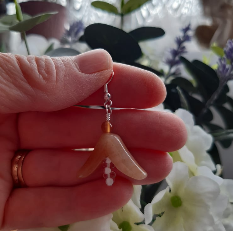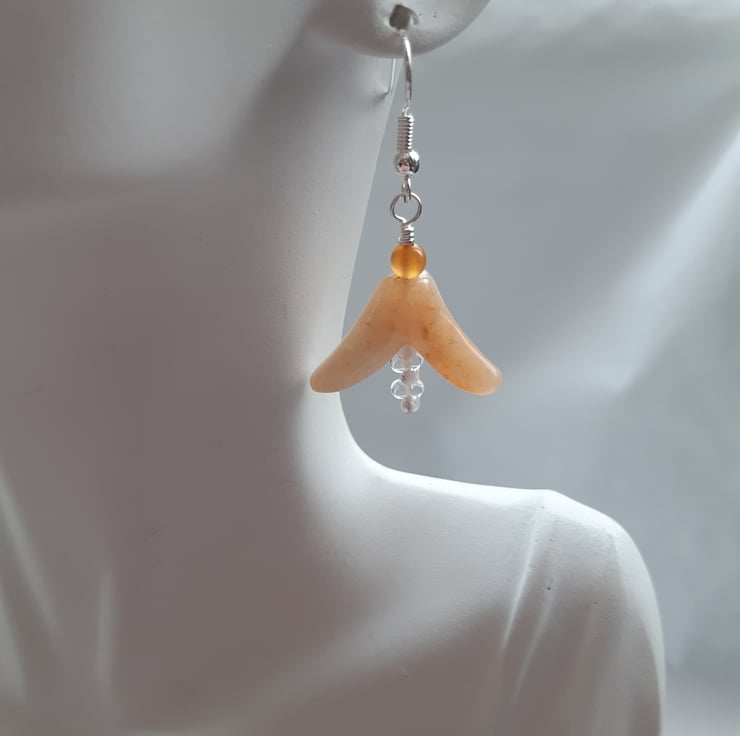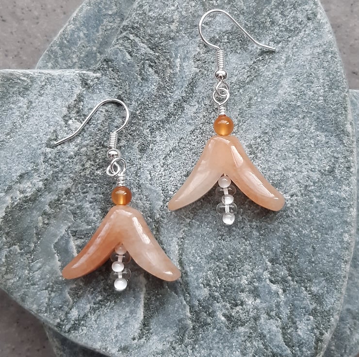 Quartzite flower bud shaped semi precious gemstones with small carnelian and whit/clear glass beads are attached to silver plated ear wires.