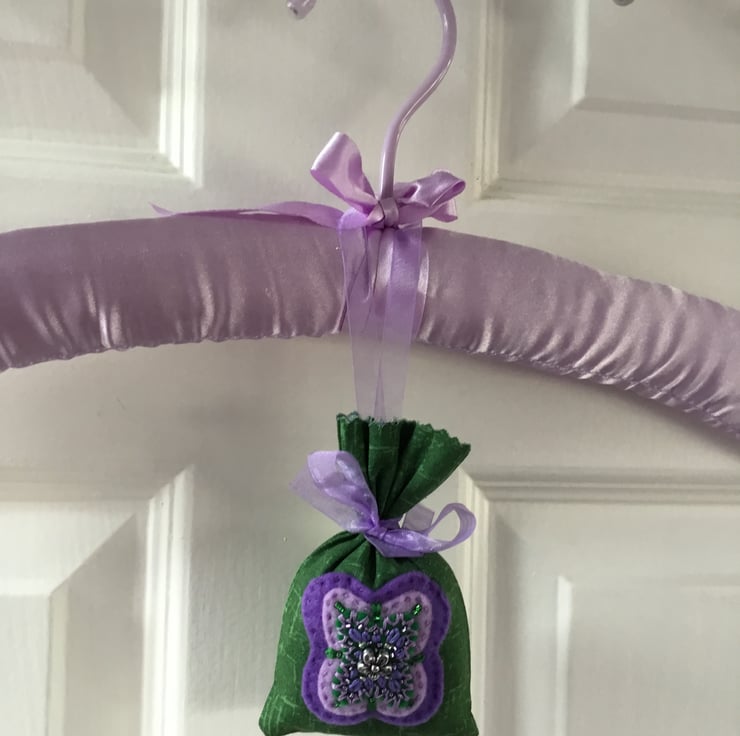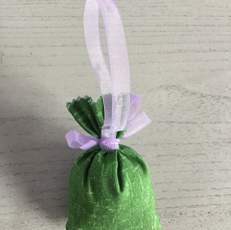 This little sack of lavender is made of a mottled green cotton fabric, tied with a lilac ribbon in a bow and a long hanging loop at the back..... so it’s ready to hang on a coat hanger, over a door or cupboard handle as a hanging decoration or, to put in a drawer with clothes.