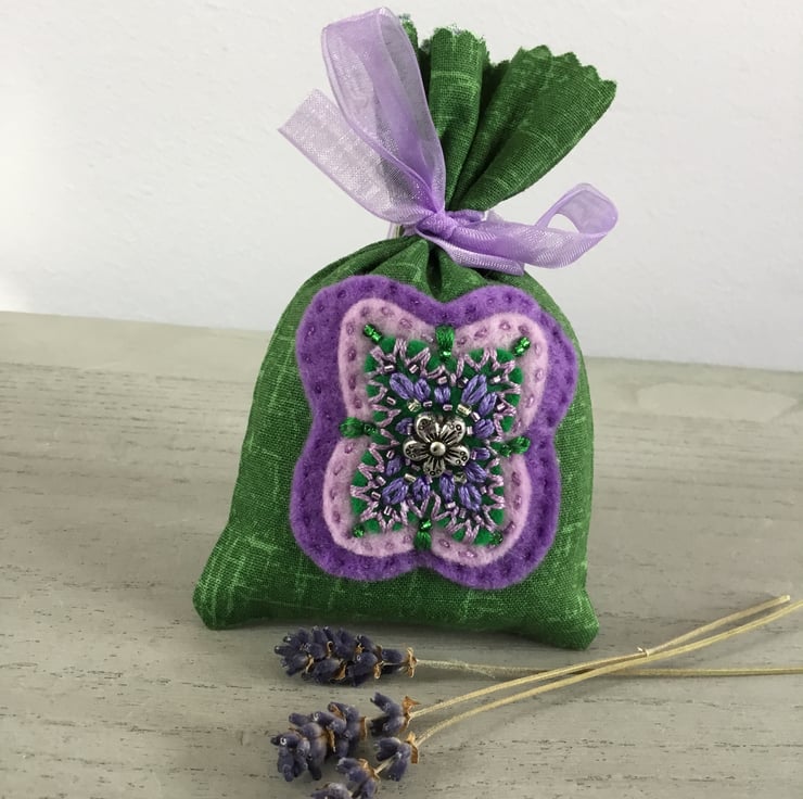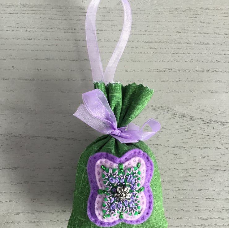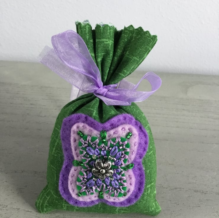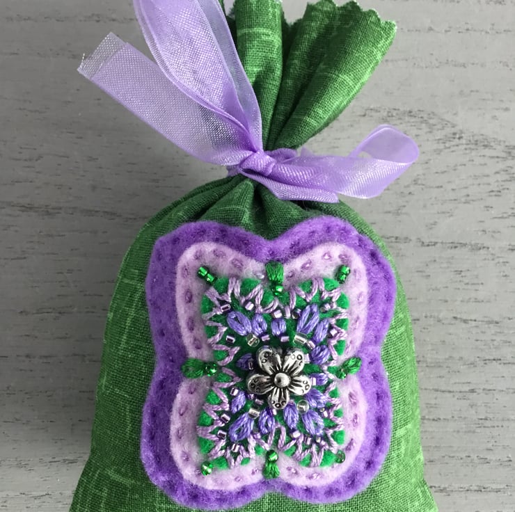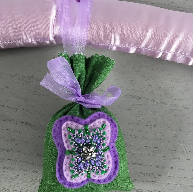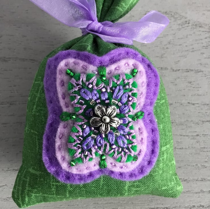 I loved creating this lavender bag in green and lilac colours....they highlight the silver daisy flower decoration at the centre of this hand embroidered lavender bag.