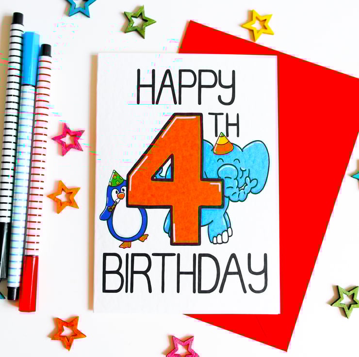 Happy 4th Birthday card, cute animal Birthday Card for 4 year old Boy or Girl