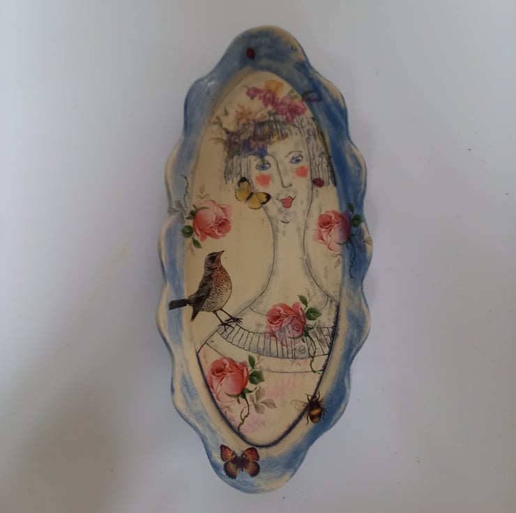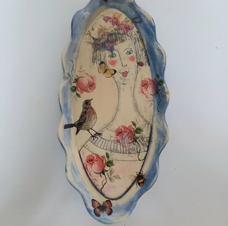 Made from white clay this shallow dish or wall hanging has been drawn and painted with coloured slips and glazed in a transparent glaze. Measures approximately 25 cms in height. Ceramic decals of flowers birds and insects are fired on to add detail. Will be carefully packed and posted.