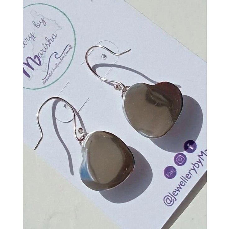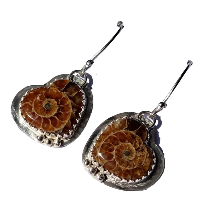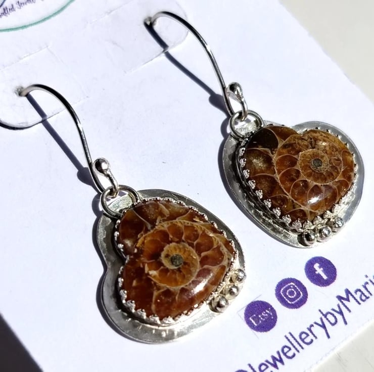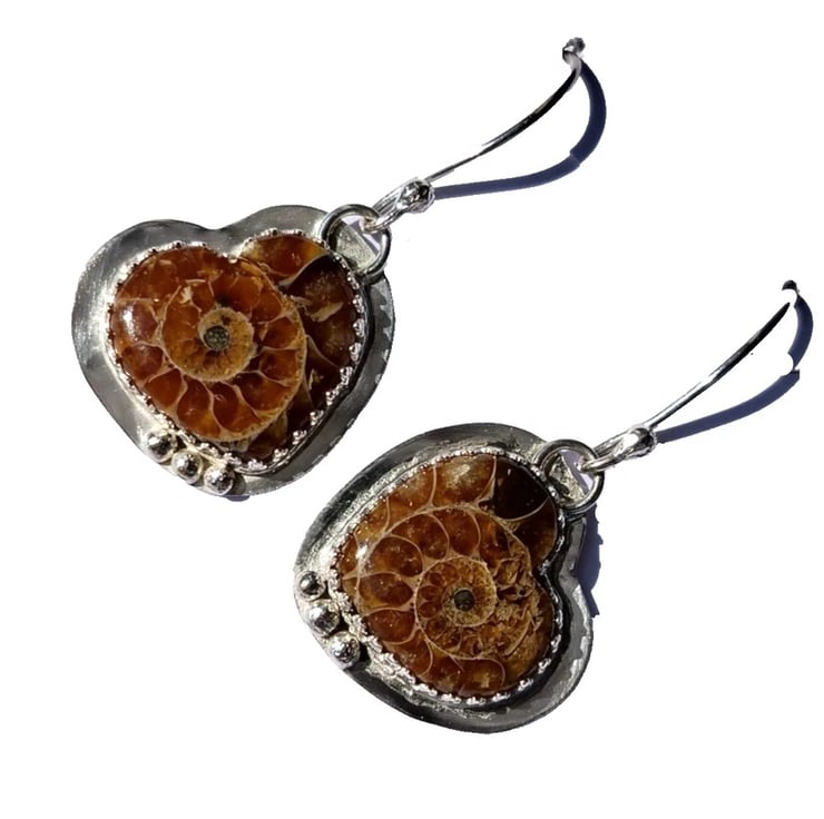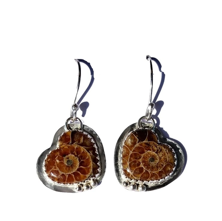 Sterling Silver 925 Handcrafted Earrings with Heart Shaped Genuine Ammonite Fossils