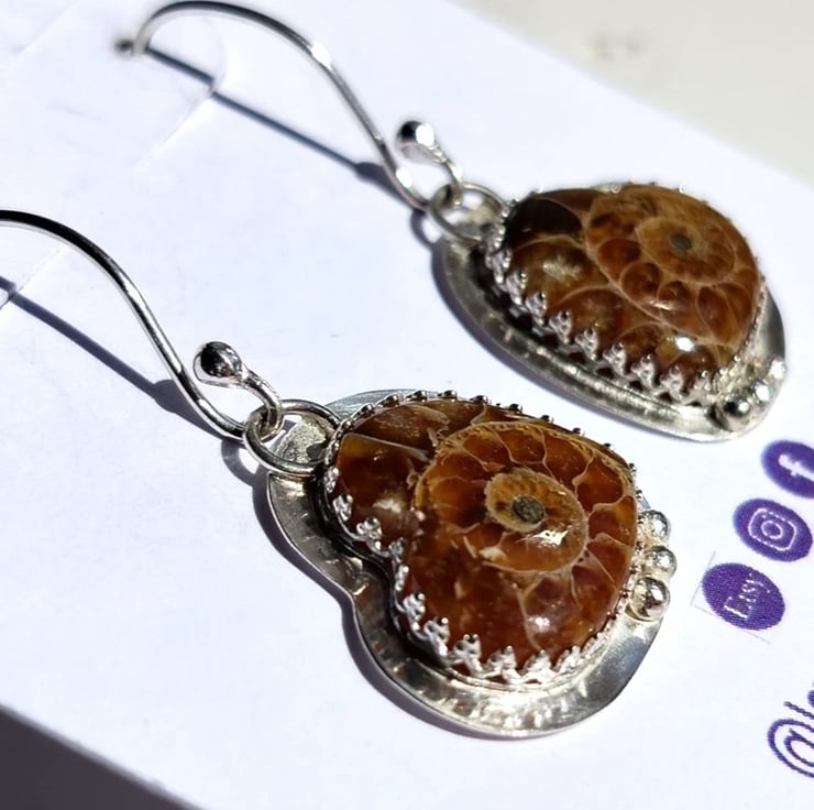 Fossils surrounded in ornate design 999 Fine Silver with a Sterling Silver 925 back and with recycled silver bubbles....I make them by melting down my leftover silver!
