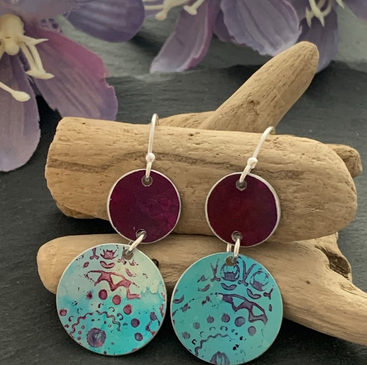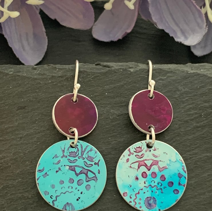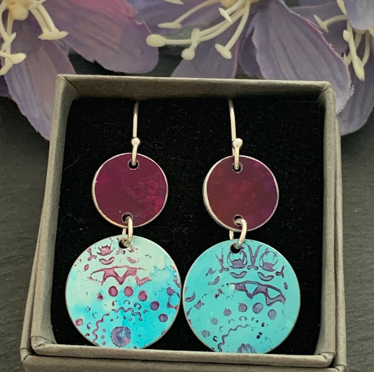 These earrings are made with a hand dyed/printed aluminium and sterling silver hook ear wires
