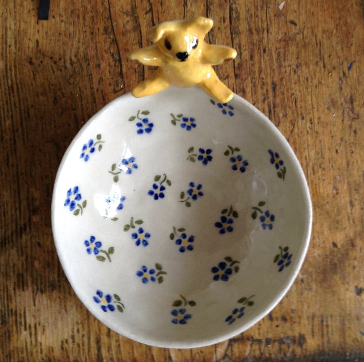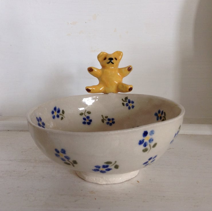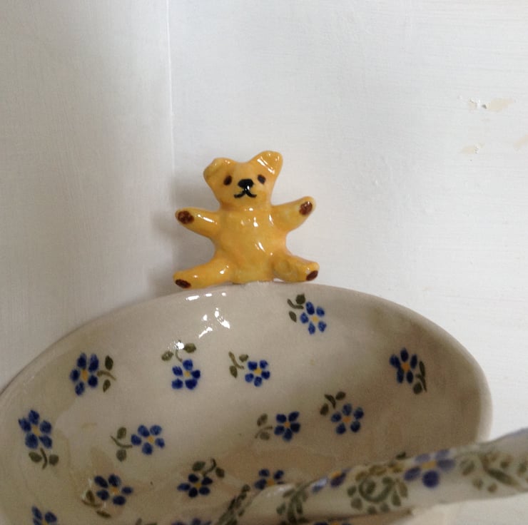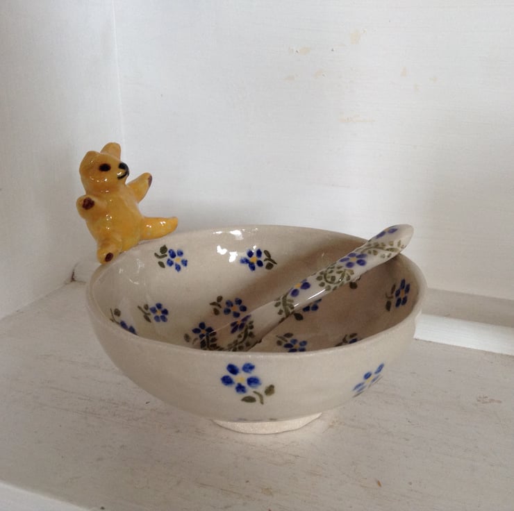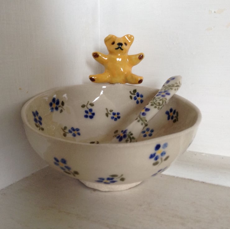 Very cute little bowl with a teddy bear on the rim. The bowl is entirely hand made using the pinch pot method and the little bear is hand modelled, The bowl is decorated with blue flowers and the teddy bear is bright yellow with brown foot pads. The bowl has a matching hand made spoon. The whole piece is made from high fired stoneware clay and has a glossy transparent glaze finish. It is great for sauces or for nuts and nibbles and measures 12.5 cms across and is 5.5 cms high and the spoon is 11.5 cms long.