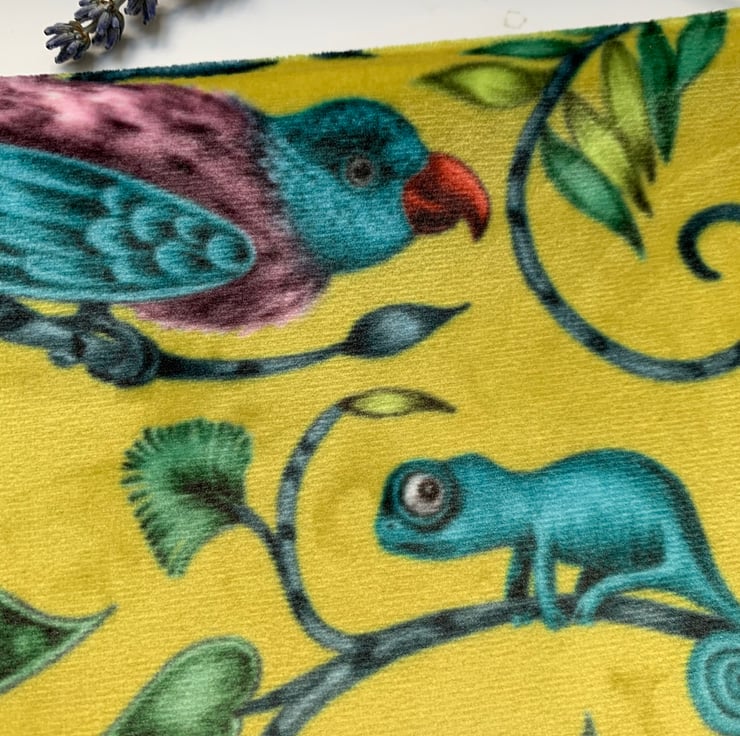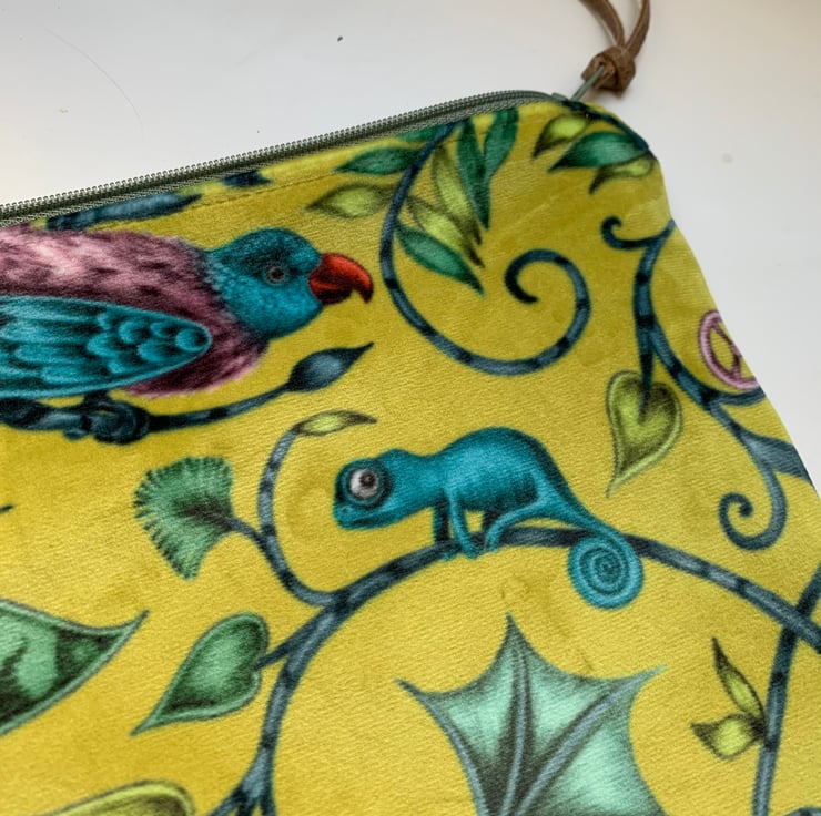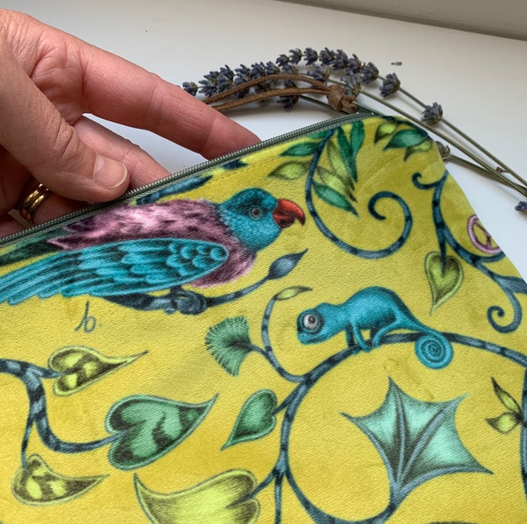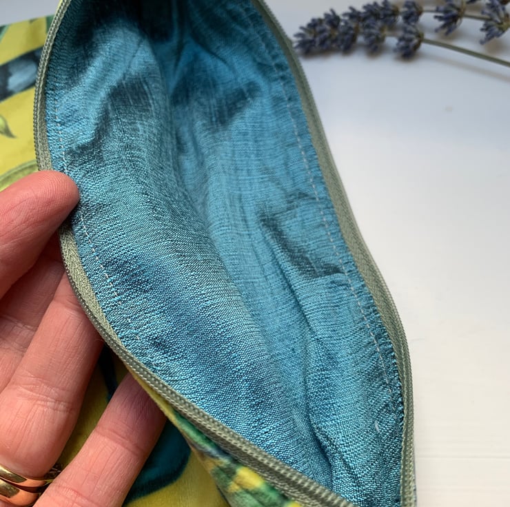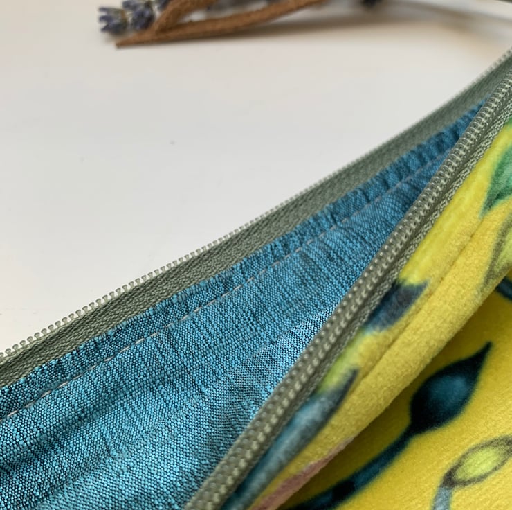 Beautiful soft zip pouch in Emma J Shipley Lime Rousseau velvet with a blue/grey linen back. The pouch is fully lined in teal silk.