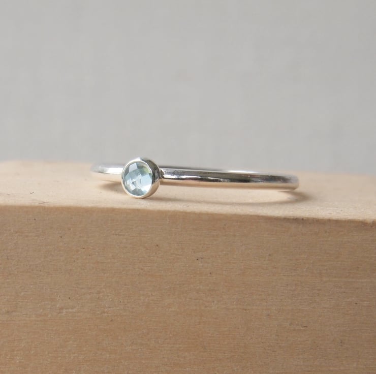 A simple ring with a modern fully round band and a small 3mm gemstone. The Blue Topaz is a pale aquamarine colour and is facet cut to reflect the light. With its Aquamarine colour, it makes a perfect gift to celebrate March birthdays with March's birthstone - Aquamarine