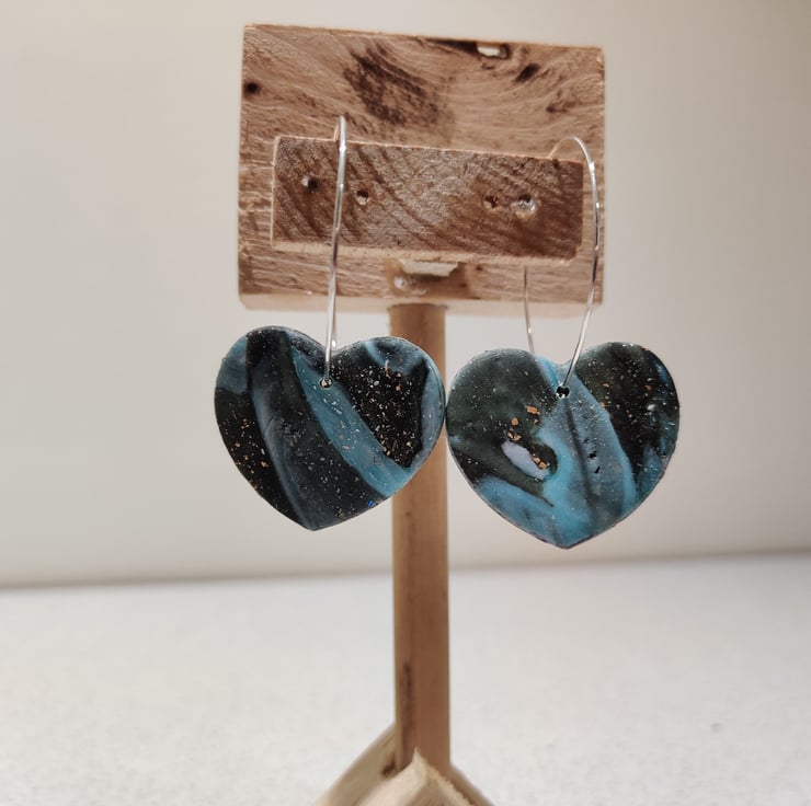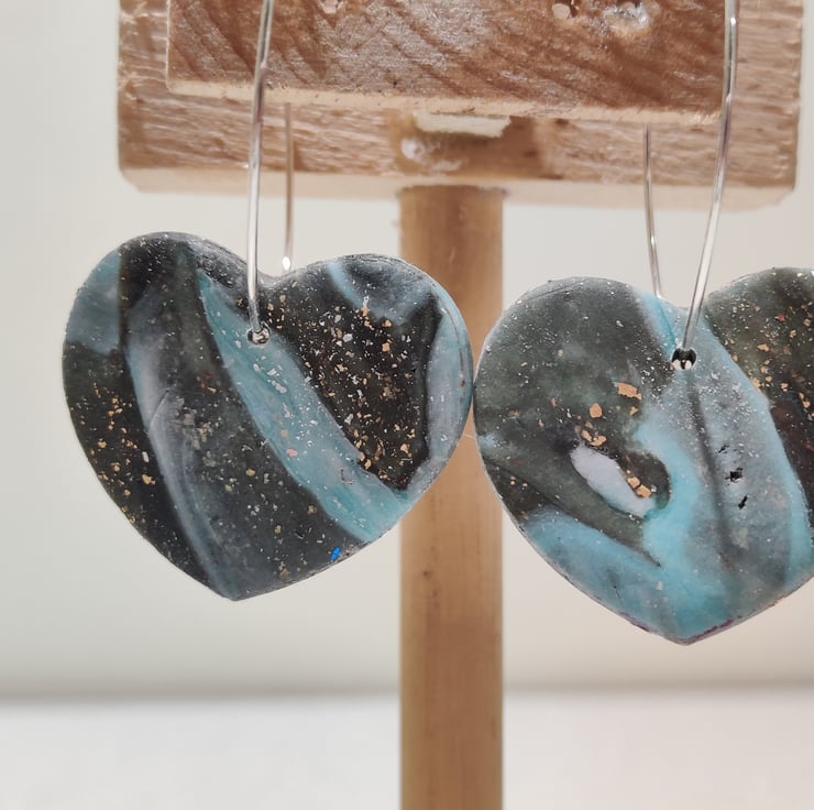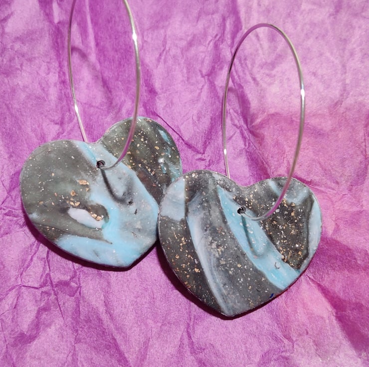 Hand made polymer clay earrings with an abstract pattern of blue swirls and with gold flake threaded through a large silver coloured hoop. . Small- medium sized. Please see all photos for close up detail. All products handmade therefore there may be minor imperfections. Each pair sold as seen, message for more info