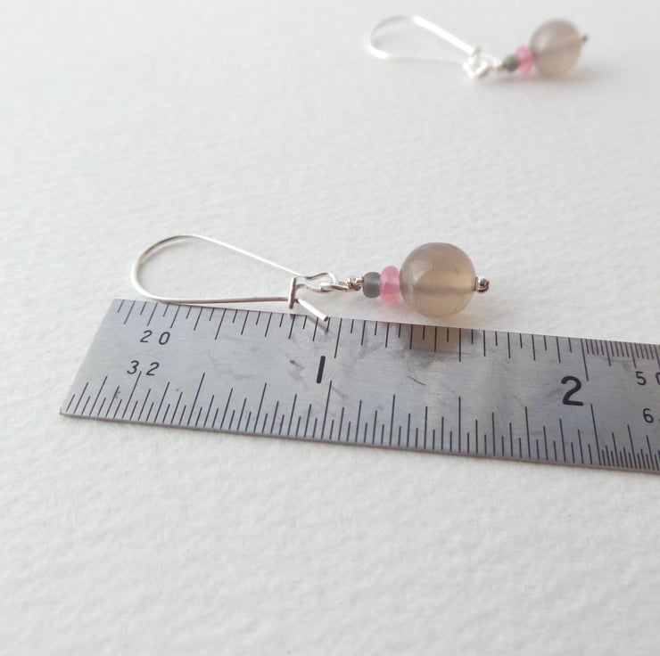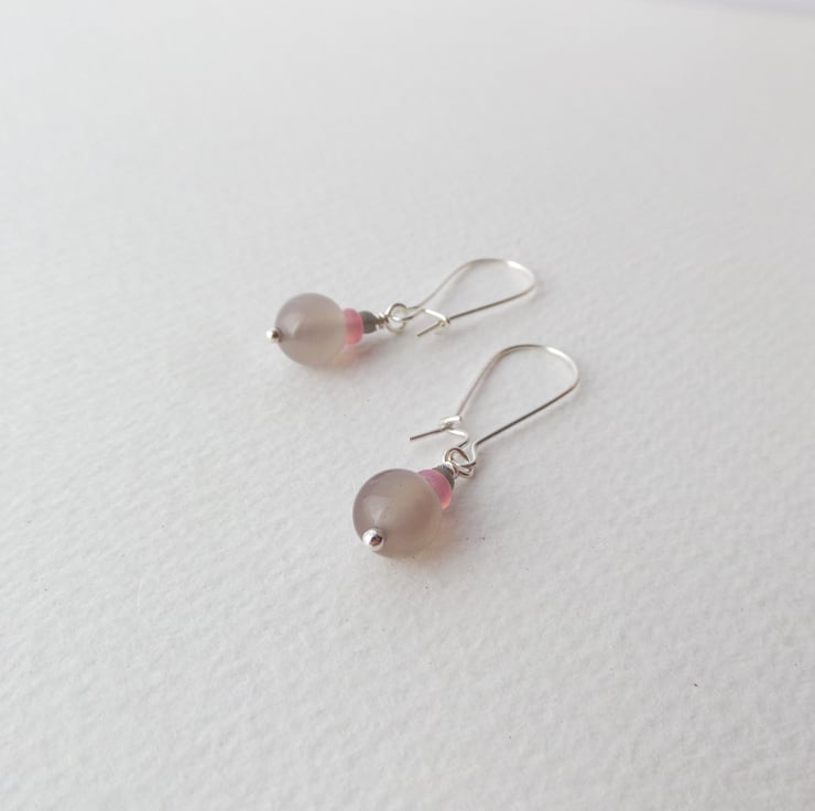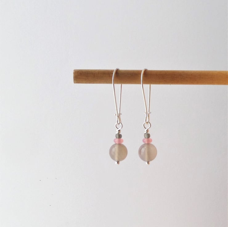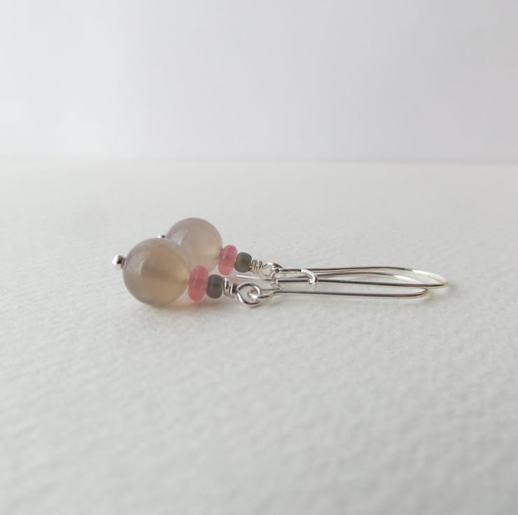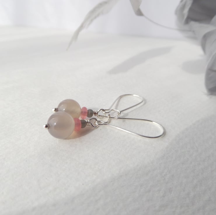 Beautiful in their simplicity, these smooth beige agate stone beads are paired up with small Strawberry Quartz discs & matt grey beads, on these lovely everyday earrings.