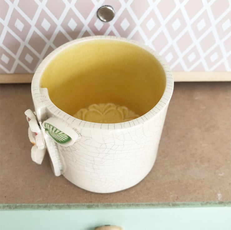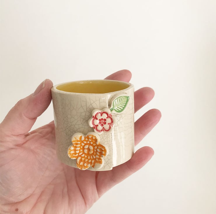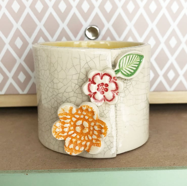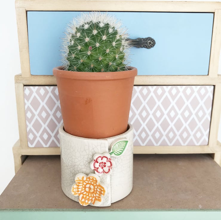 This hand built ceramic pot is made from earthenware clay. It has been hand built and decorated with pattern and embellishments. It has been fired twice in the kiln to a top temperature of 1100 degrees so it is nice and strong The perfect size for a little succulent or even for little trinkets or a tealight. This pot measures 5cm high x 6cm wide. Finished with a crackle glaze (please note that the crackle glaze is not uniform all the way round - please take a look at the photos - this is why they are a special price)