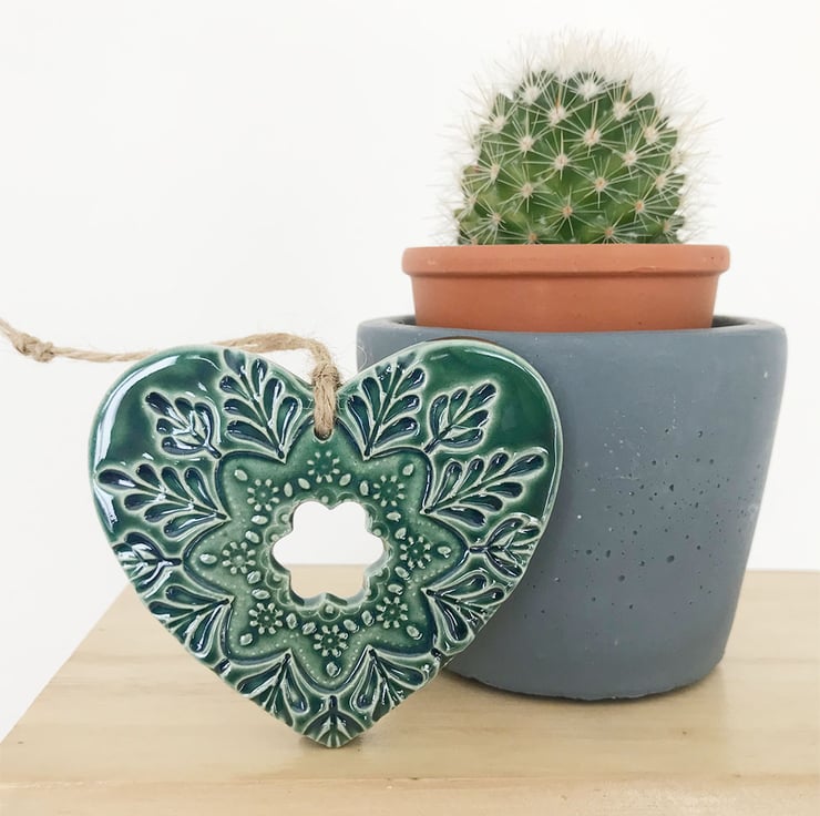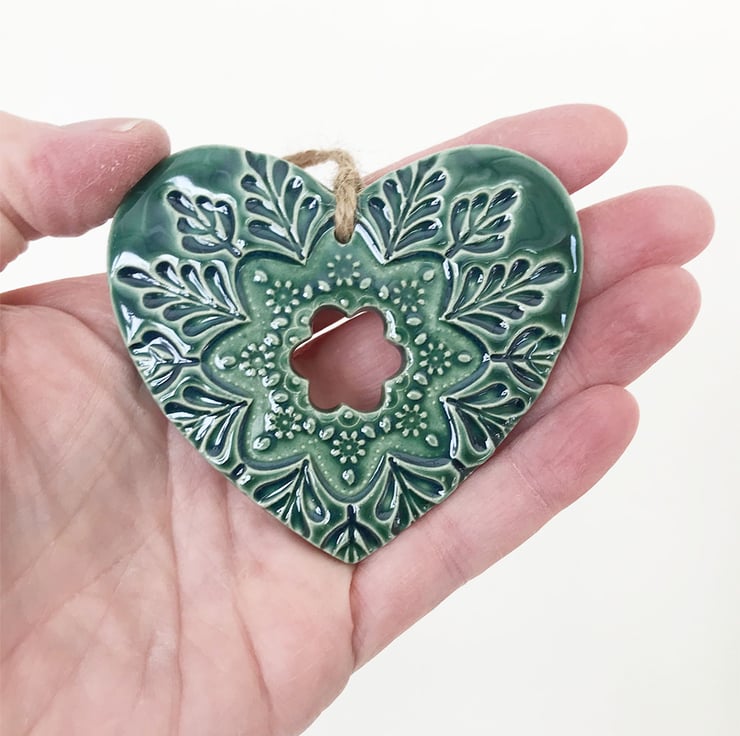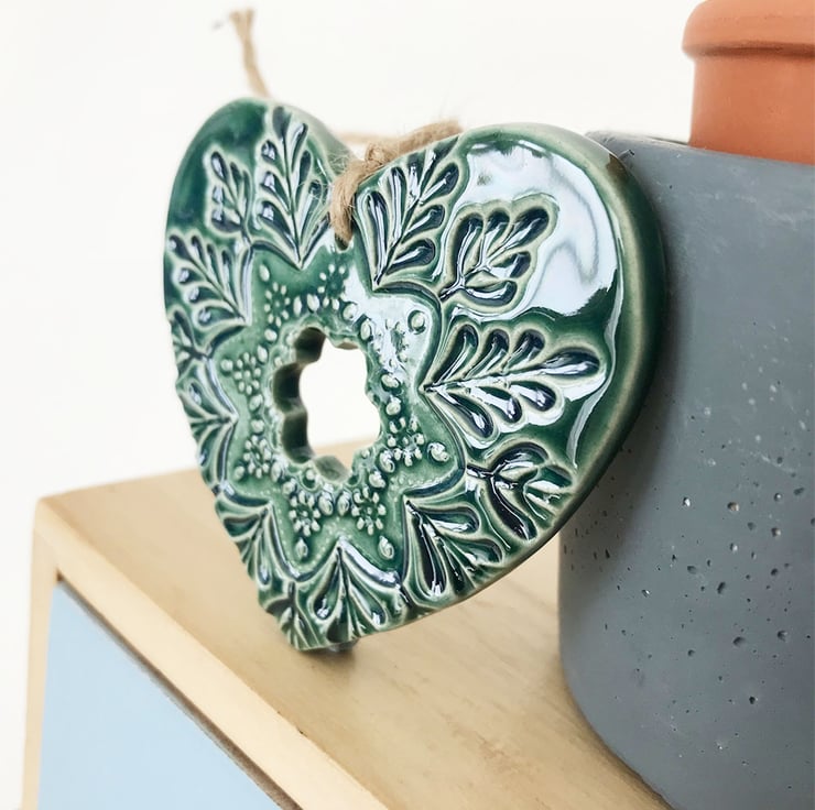 This listing is for a ceramic heart decoration. It is made from white earthenware clay, imprinted with pattern and finished with a bright, glossy glaze. It has been fired twice, once to the bisque stage and then a second firing for the glaze. It measures 7.5 centimetres wide and the same in height x 5mm thick. It can be hung outside.