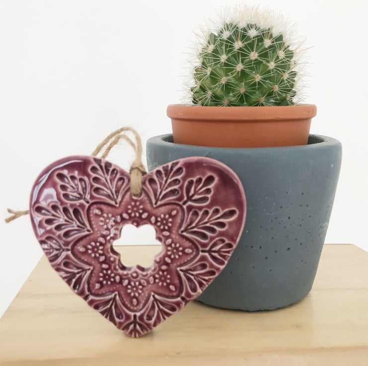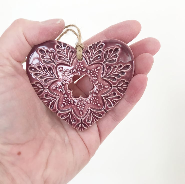 This listing is for a ceramic heart decoration. It is made from white earthenware clay, imprinted with pattern and finished with a bright, glossy glaze. It has been fired twice, once to the bisque stage and then a second firing for the glaze. It measures 7.5 centimetres wide and the same in height x 5mm thick. It can be hung outside.