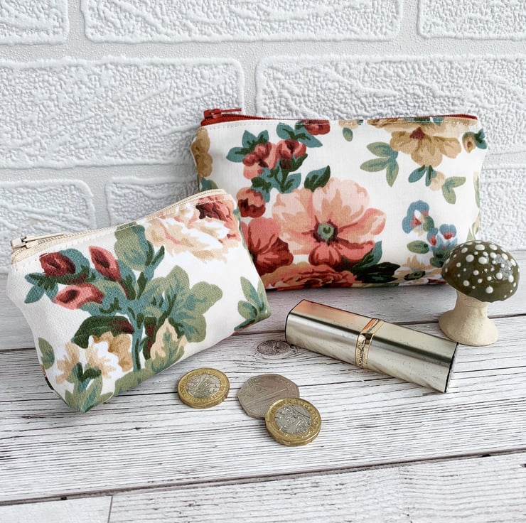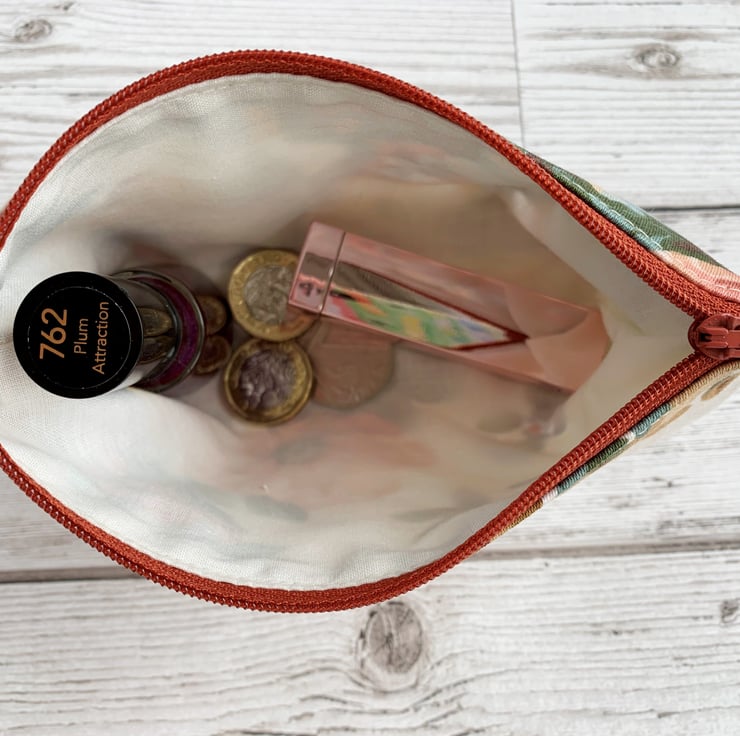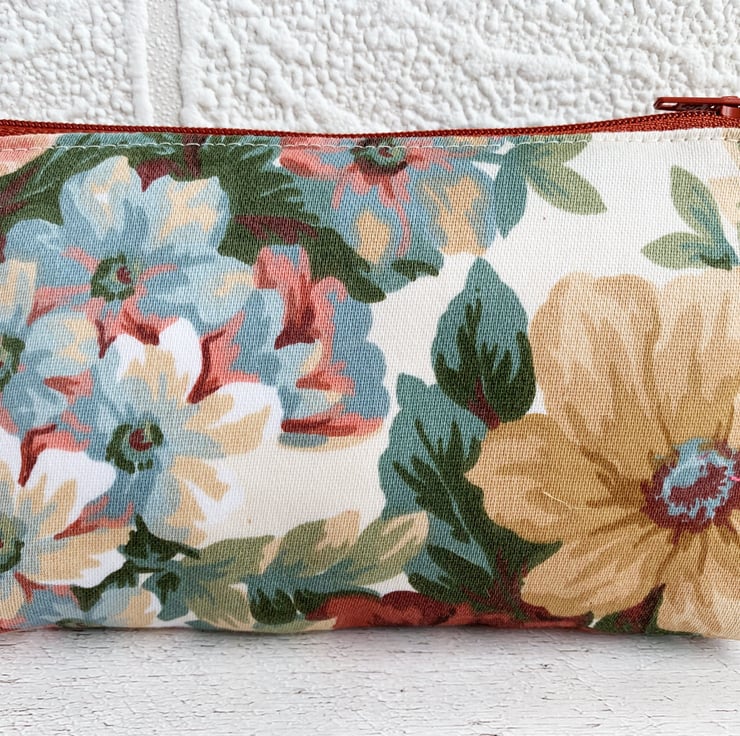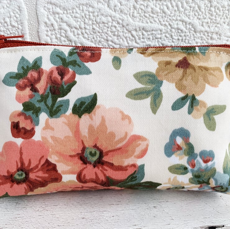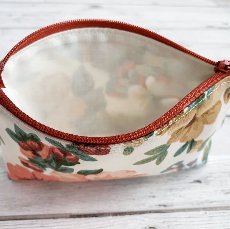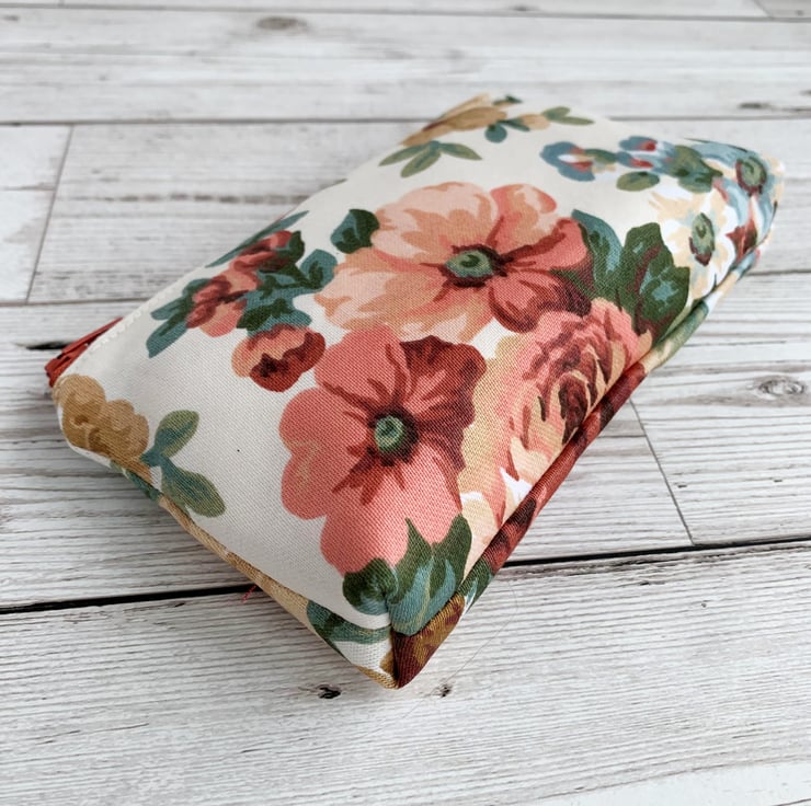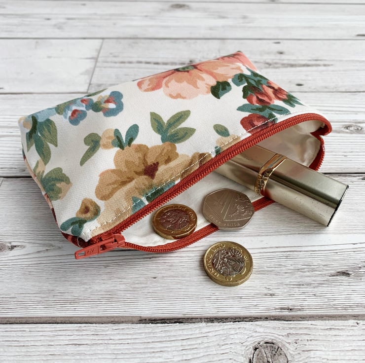 A large coin purse with a peach floral pattern. This attractive large-sized purse is made from floral print fabric in peachy shades. The pattern features flowers, buds and foliage in elegant shades of peach, terracotta, beige, blue and dark green on a cream background. The coin purse fastens with a matching terracotta coloured zip and is lined with cream fabric. The base of the purse is boxed to give more space inside.