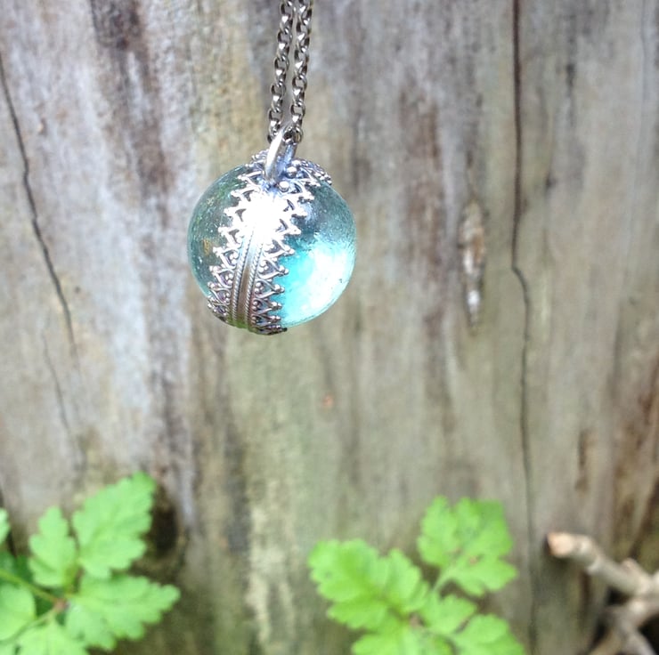 A lovely pale Aqua Codd bottle marble. Found on the Thames estuary and set in sterling silver. Choose your chain length via Options. The marble has some manufacturing marks and some wear and tear from rolling around with the tides as you would expect.