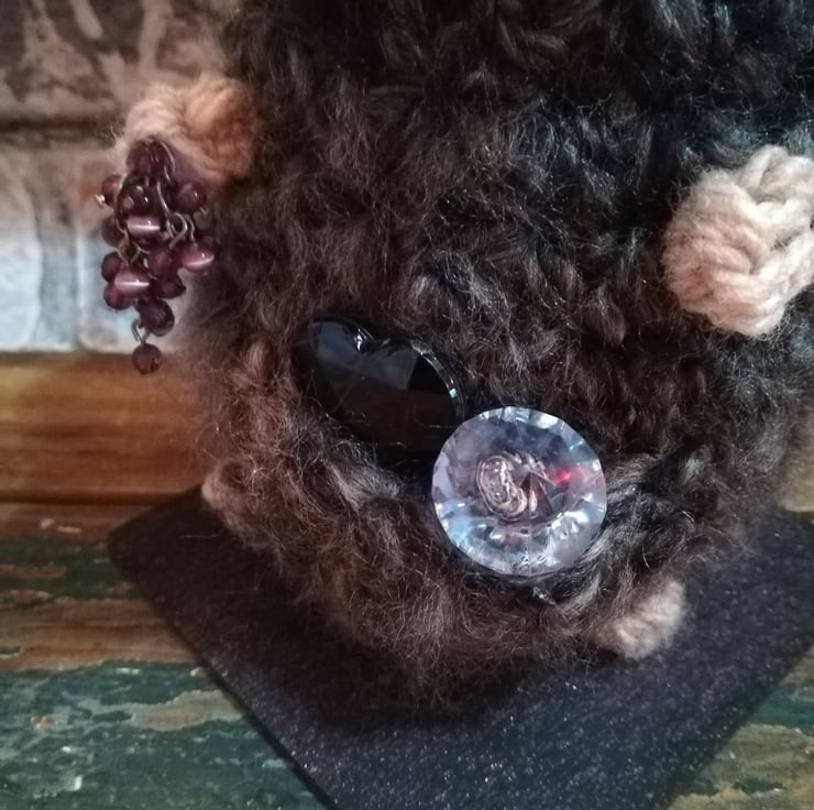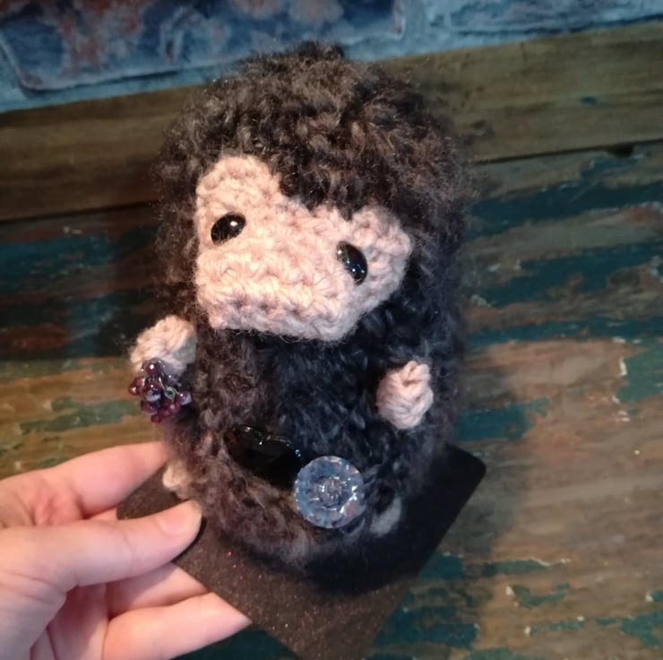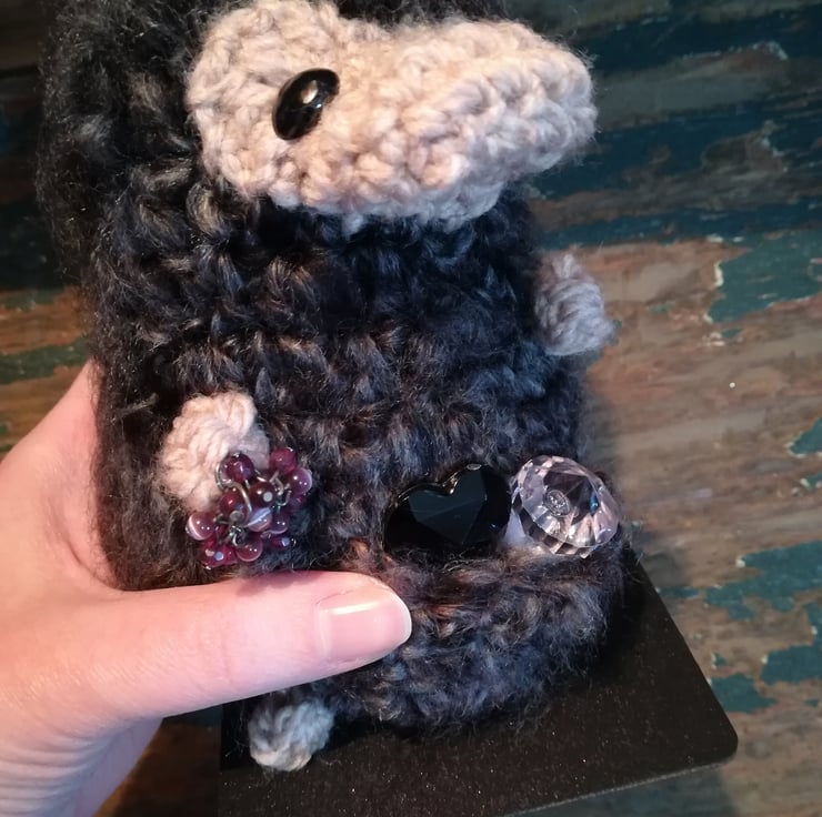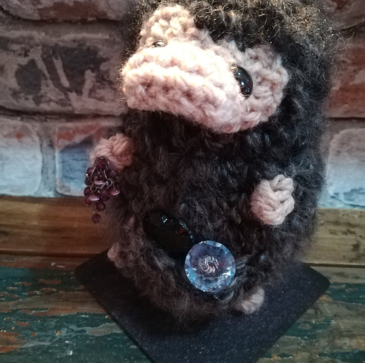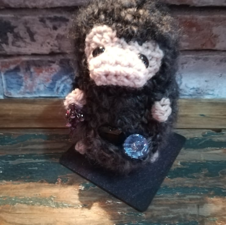 This niffler is made using a soft fluffy mottled black yarn. He is attached to a black wooden base and has jewels in his pouch and hand.